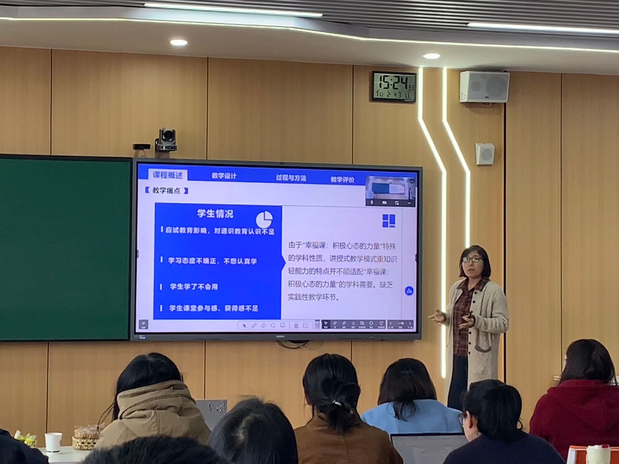 罗娟老师在比赛中分享的是《幸福课:积极心态的力量》课程的混合式教学设计,罗老师开门见山分析了目前幸福课课程的教学痛点,突出表现为重理论轻实践。老师设计了基于OBE理念的双元互动式教学设计,打通了第一第二课堂,将理论知识与实践活动有机融合起来,最大程度上缓解教学痛点。在教学活动中还有针对性地将学生们最为渴求的积极人际关系的培养作为课程重点环节,并将思政案例巧妙嵌入其中。