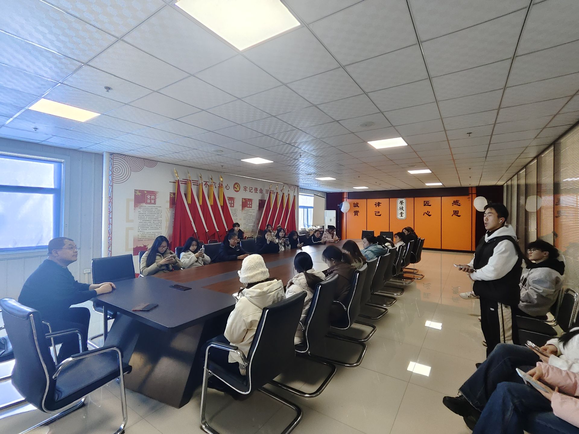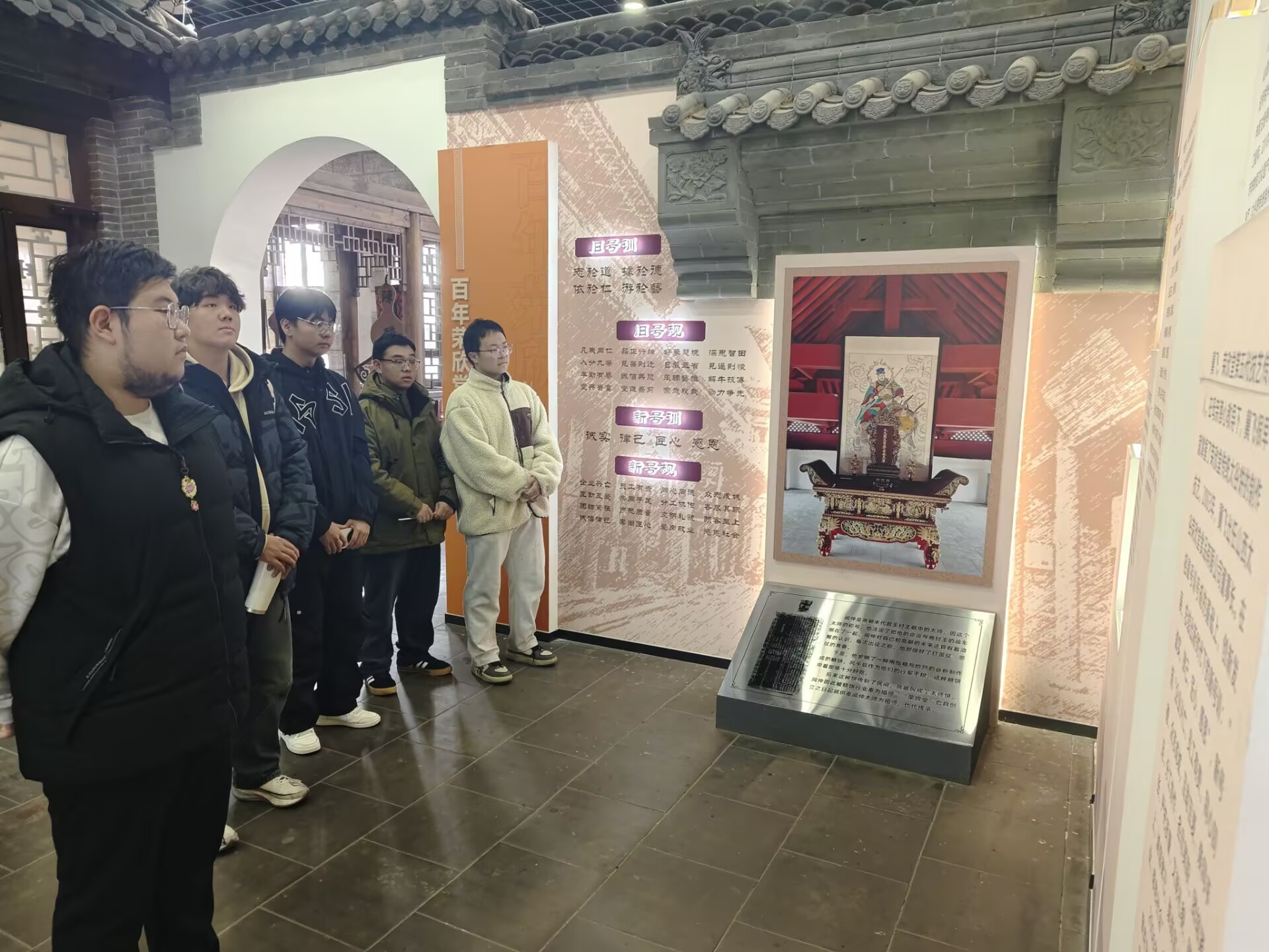 穿过博物馆,一条充满艺术气息的非遗走廊映入眼帘。这里汇聚了晋中地区的形意拳、砖雕、中医药等非遗项目,每一件作品都诉说着匠人的心血与智慧。戴国庆老师邀请文史协会爱好者与非遗传承人现场交流,抛出关键问题:“同学们,你们觉得这些非遗项目面临的最大挑战是什么?是技艺的失传,还是市场的萎缩?”同学们分组讨论,与传承人深入对话,从“三体式”站桩、“一凿一刻”、“九蒸九晒”的细节中,感受到非遗传承的艰辛与坚守。