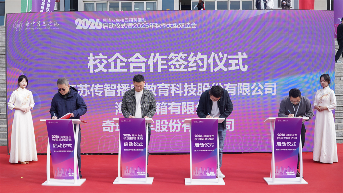 校企合作签约环节中,晋中信息学院校长姬宇与江苏传智播客教育科技股份有限公司、海信冰箱有限公司、奇瑞汽车股份有限公司三家企业代表共同签署战略合作协议,随后还邀请到小米之家科技有限公司进行了现场企业路演宣讲。此次签约及路演不仅是校企资源互通、协同育人的重要举措,同时为拓宽学生实习就业渠道、推动产学研融合奠定了坚实基础。