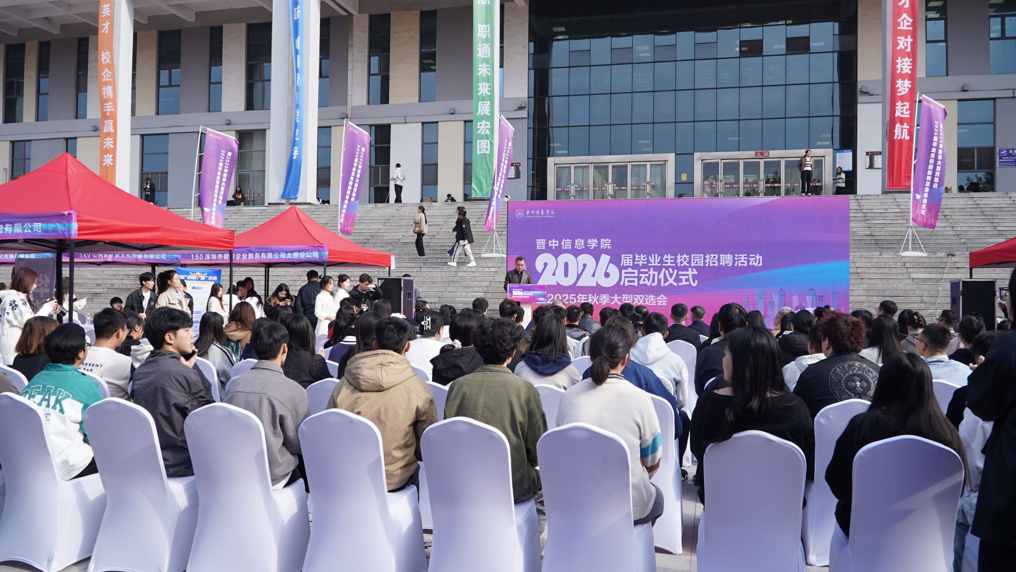 10月15日,晋中信息学院2026届毕业生校园招聘活动启动仪式暨2025年秋季大型双选会于图书馆前广场圆满举行。山西省教育厅学生处处长武振杰,晋中市太谷区人力资源和社会保障局党委书记、局长范俊宝,晋中市太谷区就业和人才服务中心主任许建勇、副主任李戈,学校党委书记张存伟、校长姬宇、校长助理杨碧霞以及二级学院院长等领导嘉宾莅临现场,共同开启了启动仪式与招聘活动的序幕。本次双选会吸引了来自北京、上海、河北、江苏、广东、山西等全国多个省市的200余家企业参与,涉及信息科技、智能制造、金融、教育、文化传媒、农林牧渔等多个行业领域,其中包括多家国有企业、知名上市公司以及世界500强企业。这些企业累计提供1000余个岗位,需求人数达7000余人,吸引了全校上万名学生积极参与,现场氛围热烈。