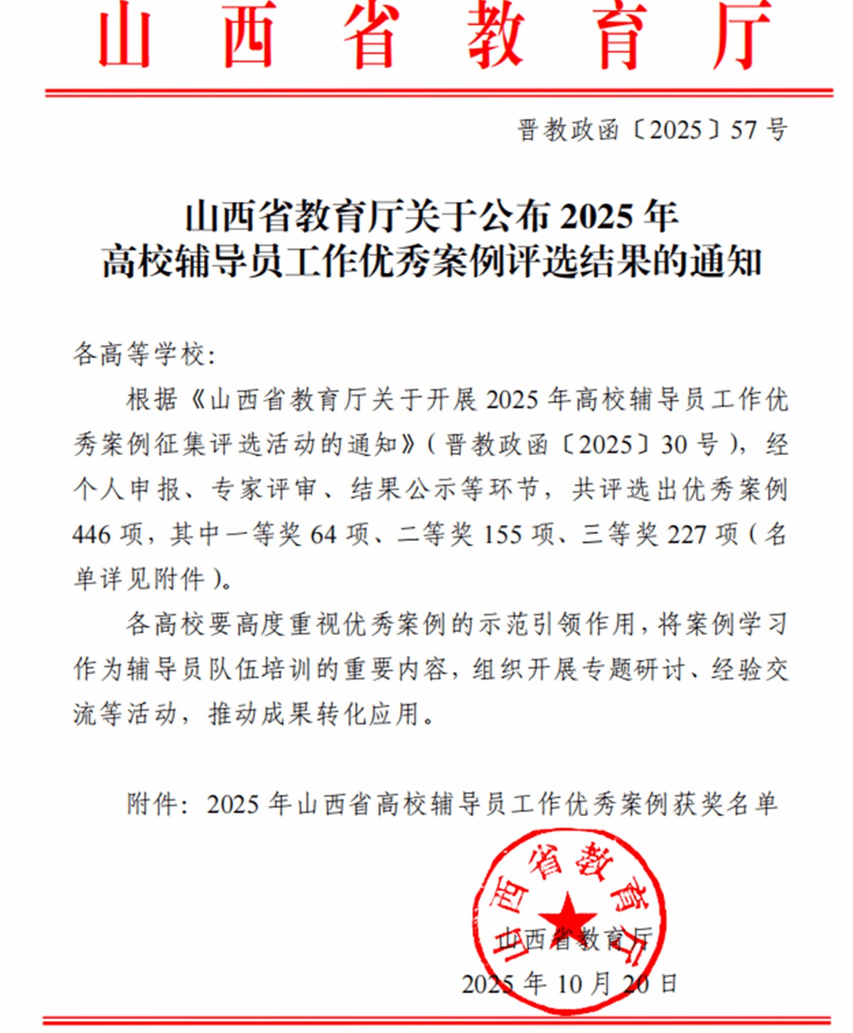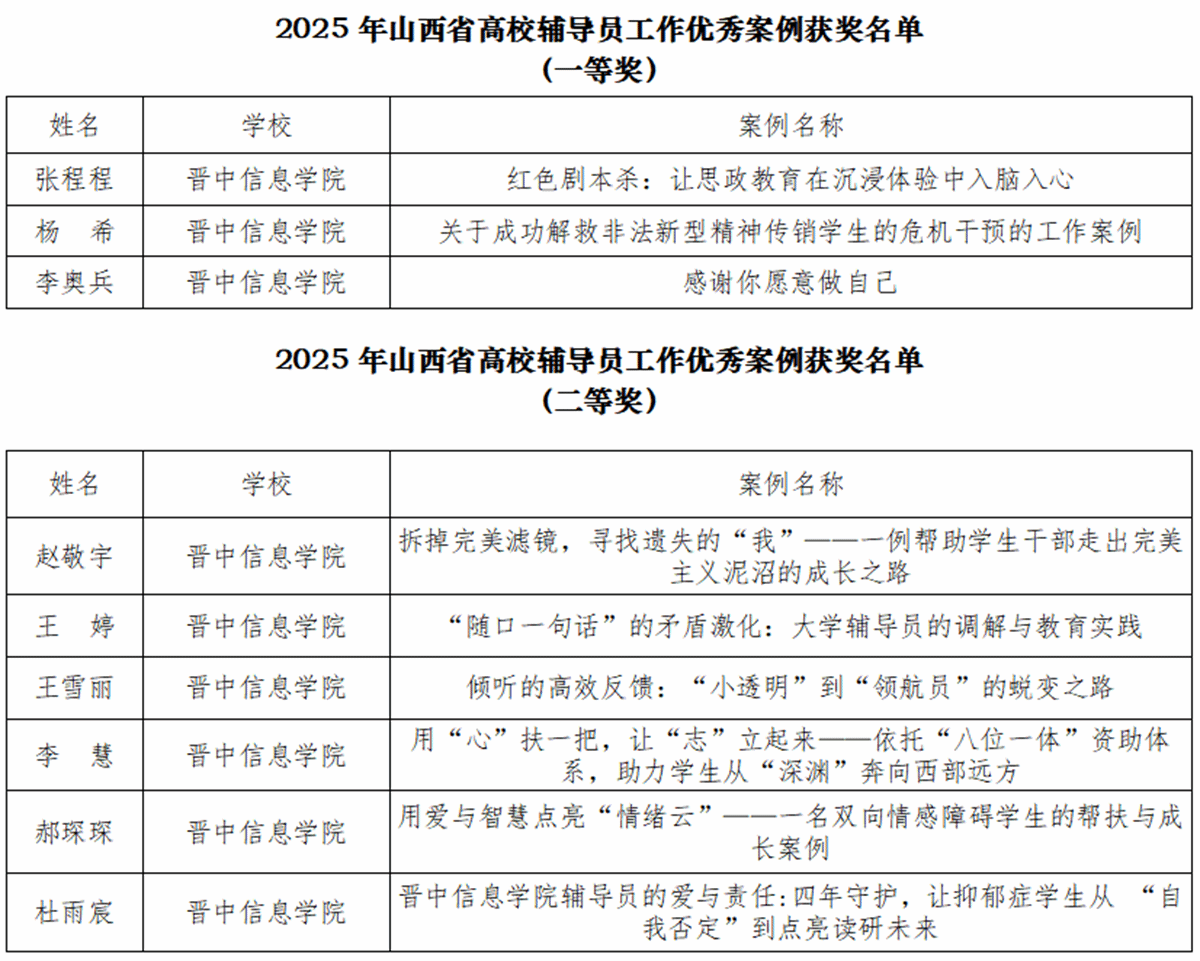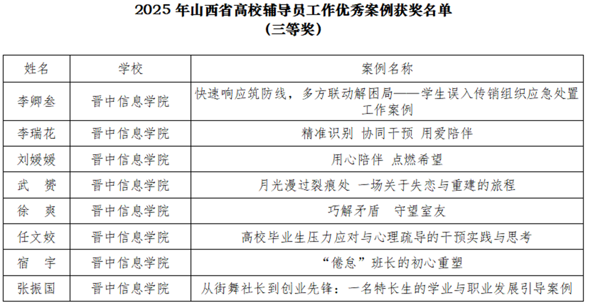 山西省教育厅近期公布2025年高校辅导员工作优秀案例评选结果,晋中信息学院17名辅导员工作案例从众多参评作品中脱颖而出、成功入选,其中张程程、杨希、李奥兵荣获一等奖,赵敬宇等6人荣获二等奖,李卿叁等8人荣获三等奖。