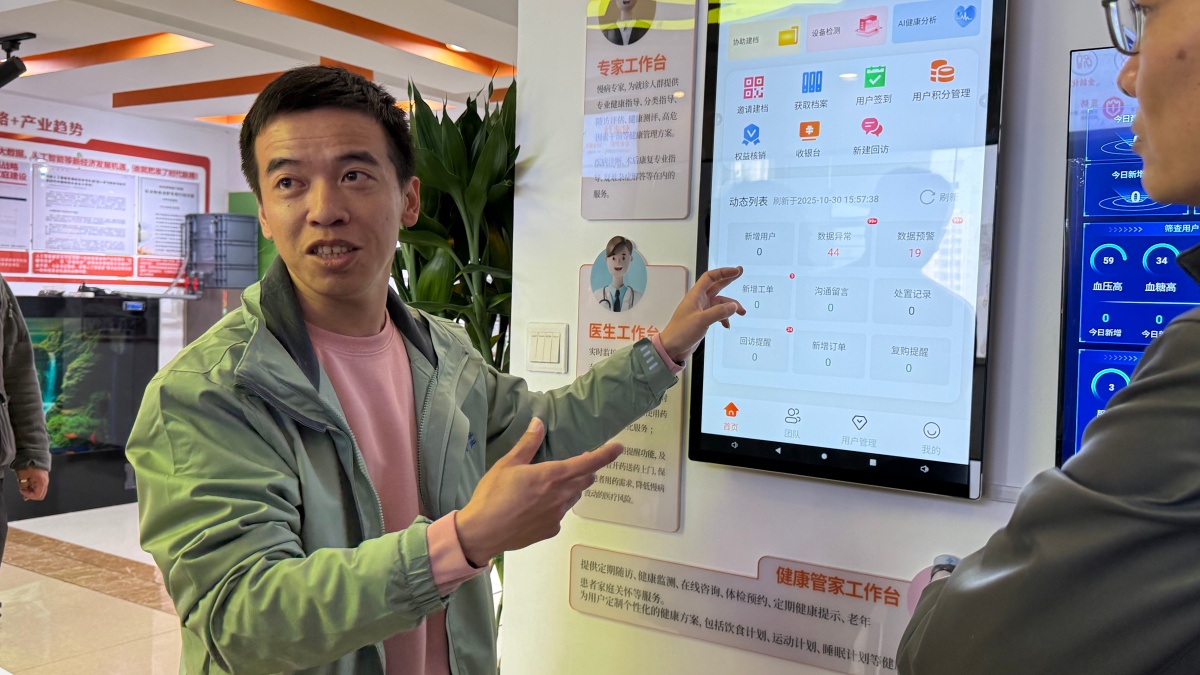 在企业负责人的引导下,张海明院长一行首先走进多对多物联智慧生活体验中心,重点参观了核心产品矩阵与大数据运营平台。现场演示中,“多对多智慧管家机器人”凭借跨品牌、跨品类的物联连接能力,实现了健康设备、睡眠监测、智能安防等全屋产品的语音与APP双控操作,其荣获粤港物联网大赛“最佳应用奖”的技术实力获得来访人员高度评价。在大数据平台展区,总经理助理钟顺优详细讲解了数字健康解决方案的应用逻辑:通过可穿戴设备实时采集全年龄段人群的健康数据,结合智能算法构建私人健康数据库,实现高血压干预、睡眠管理、营养指导等精准服务,目前已联动2000余款智能产品与400多个专业品牌形成服务生态。张海明院长指出,这种“家庭-社区-机构”的健康管理闭环,与学院公共健康、食品营养等专业培养方向高度契合,为实践教学提供了鲜活样本。