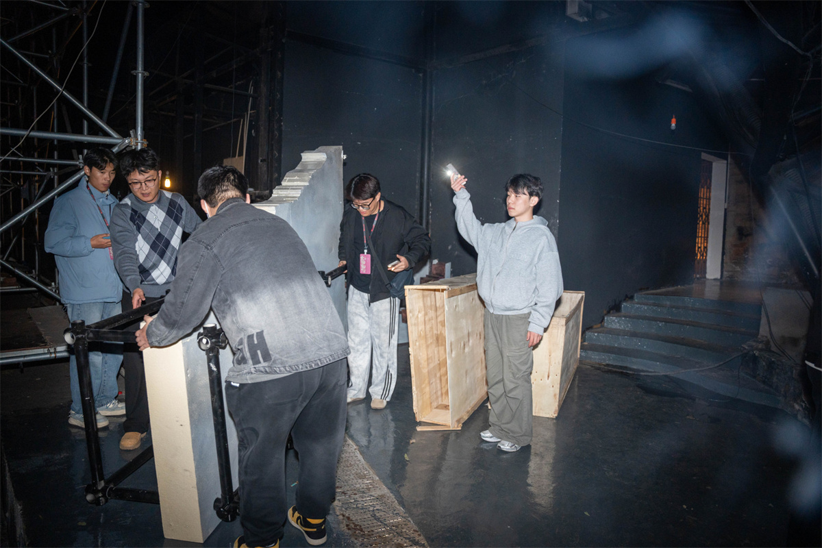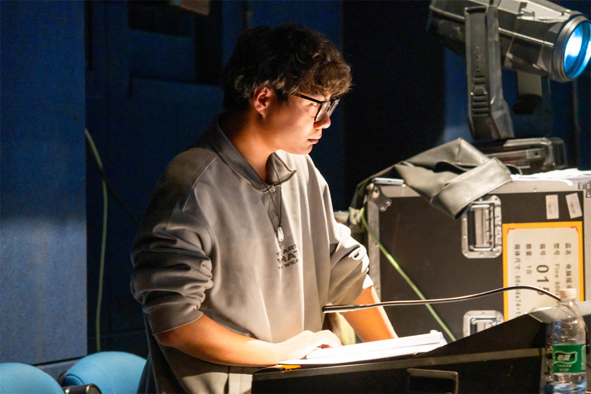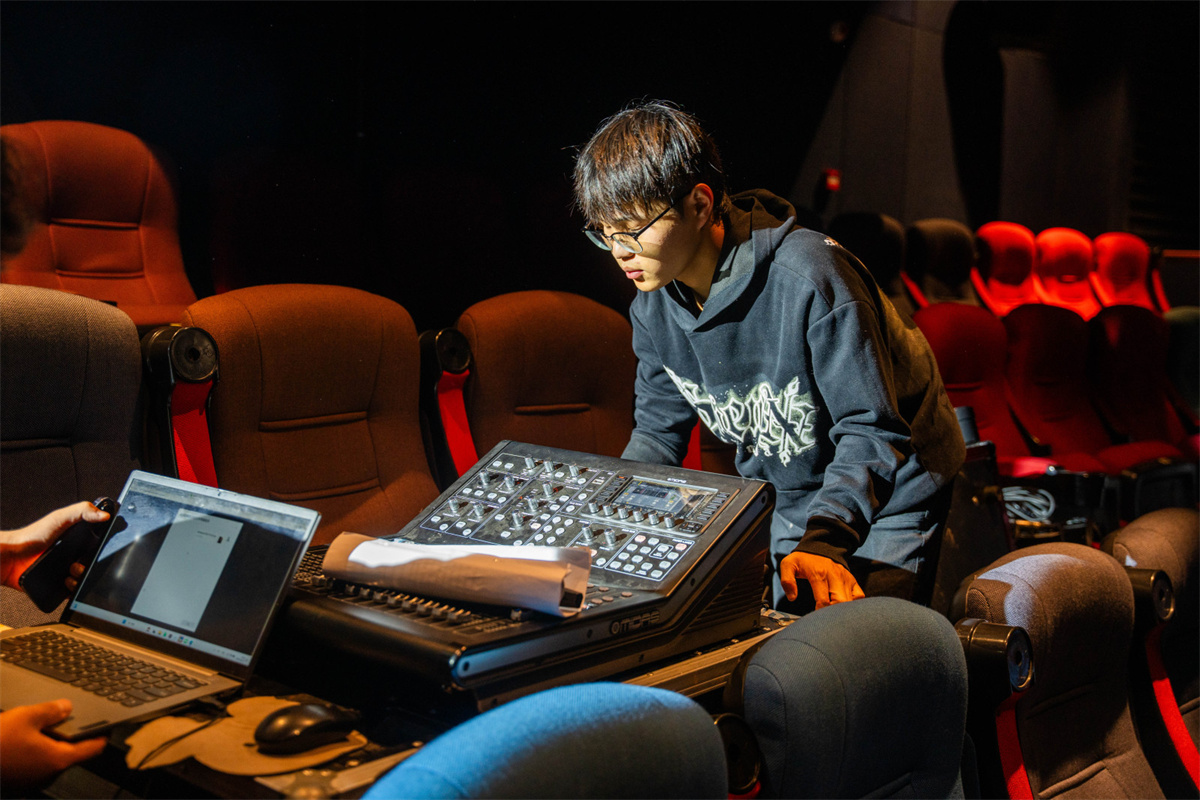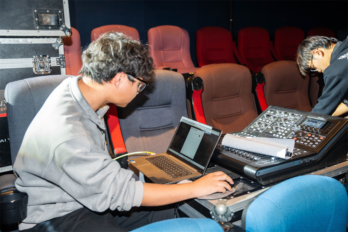 台前的精彩,离不开幕后的默默付出。灯光师鹿馨月同学说:“灯光不只是照亮舞台,它是情绪的语言,是故事的延伸。”调音台前,调音师卫梦飞同学正全神贯注应对着陌生场地带来的多重挑战。“初到大凉山的陌生场地,接耳麦、对频、调参数都比校园活动更有挑战,但当演员台词清晰传递、音乐与剧情完美融合,我才懂调音不只是技术操作,更是用声音为戏剧‘搭台’,也对‘声音服务于艺术’有了更真切的理解。”