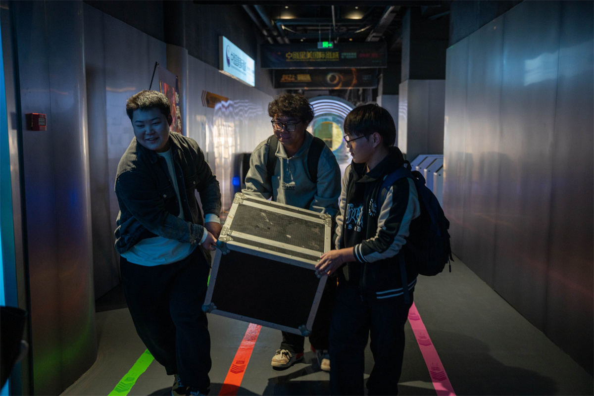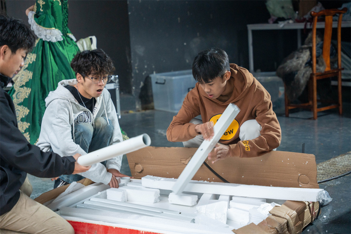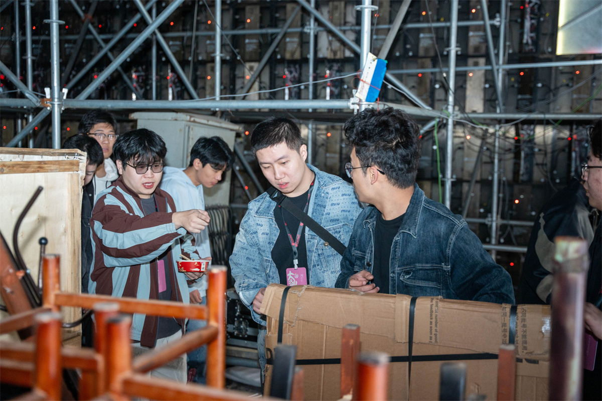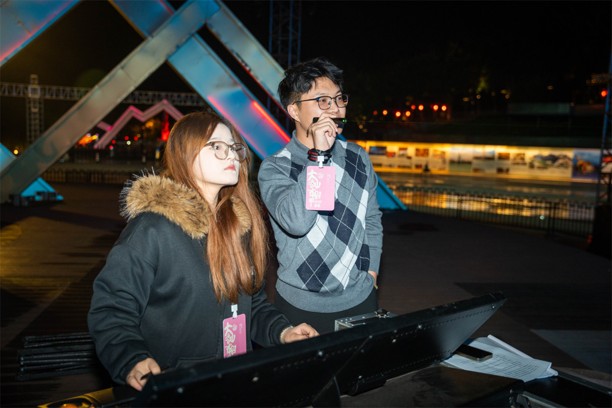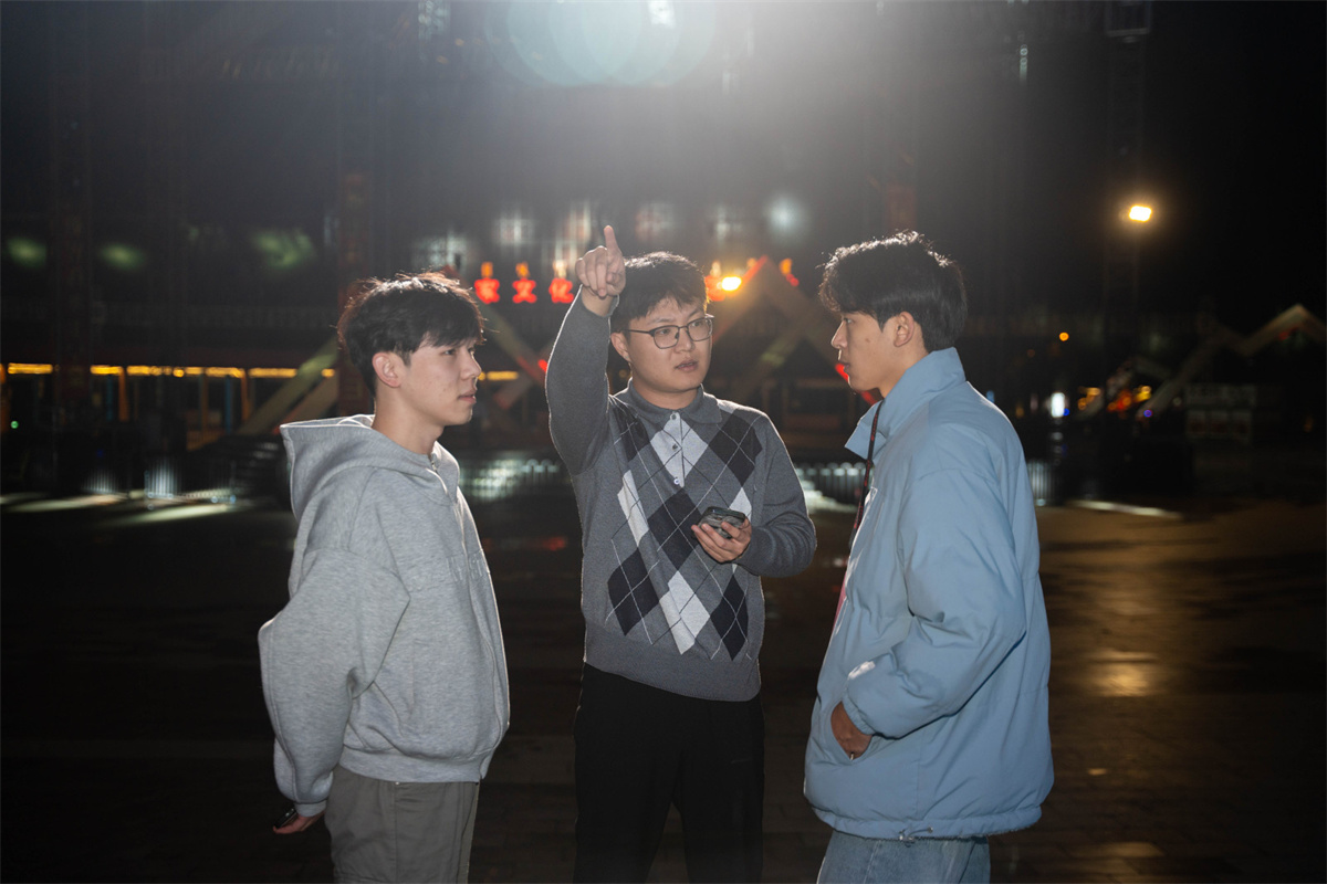 台前的精彩,离不开幕后的默默付出。灯光师鹿馨月同学说:“灯光不只是照亮舞台,它是情绪的语言,是故事的延伸。”调音台前,调音师卫梦飞同学正全神贯注应对着陌生场地带来的多重挑战。“初到大凉山的陌生场地,接耳麦、对频、调参数都比校园活动更有挑战,但当演员台词清晰传递、音乐与剧情完美融合,我才懂调音不只是技术操作,更是用声音为戏剧‘搭台’,也对‘声音服务于艺术’有了更真切的理解。”