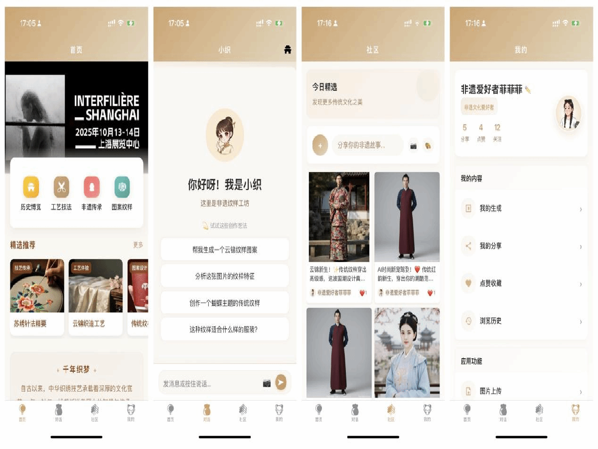 《织语WeaveVerse——多模态交互的非遗纹样服装设计与智能试穿系统》是一款面向中华非物质文化遗产的数字化创新平台,旨在通过多模态AI技术实现传统纹样的现代解读与互动式传承。平台将图像识别、AI纹样生成、虚拟试穿以及文化知识解读融为一体,为用户提供从上传纹样、智能分析、服装设计到沉浸式试穿的完整创作体验。通过轻量化AI模型与FastAPI高性能后端架构,系统能够在移动端快速完成纹样识别与设计生成,降低使用门槛,让没有设计基础的普通用户也能参与非遗创作。平台不仅构建了结构化的非遗纹样知识图谱,还打造了社区化的创作交流空间,使用户能够分享作品、互相启发,共同推动非遗文化的现代传播。以“数字活化传统文化”为核心理念,通过科技赋能,让千年纹样在数字时代焕发新的生命力,成为连接传统艺术与年轻群体的全新文化桥梁。