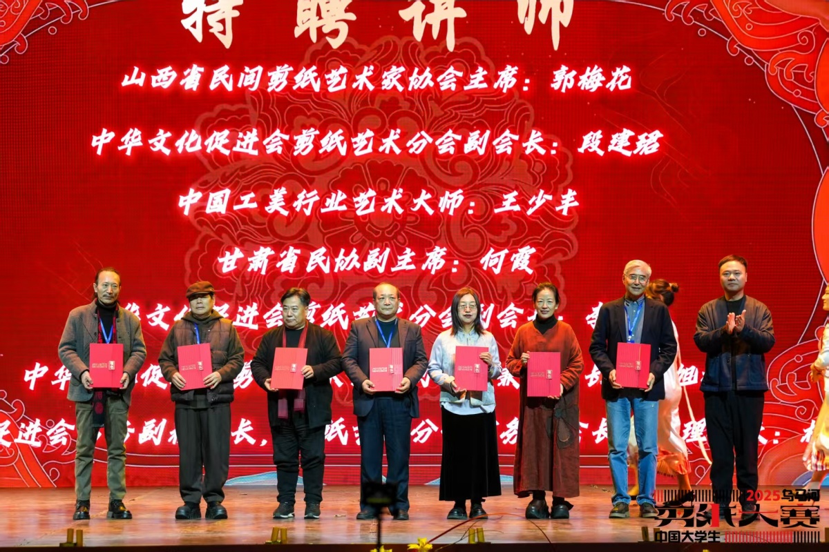 在颁奖典礼现场,由学校常务副校长刘正国为7位剪纸行业大师颁发中华文化促进会剪纸艺术分会晋中信息学院研习基地特聘讲师聘书,这一重要举措正是“以美育人、以文化人”育人理念的生动实践,通过大师引路,为剪纸艺术在学校的有效传承提供了优质师资保障,也为剪纸艺术的未来发展注入了新的活力。