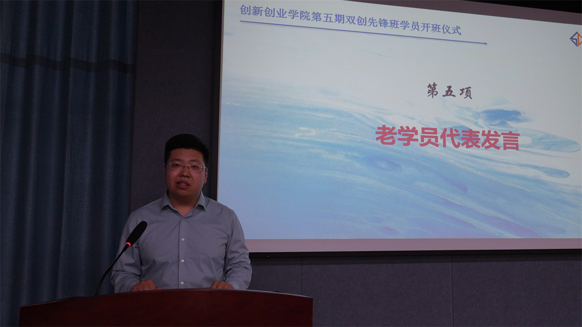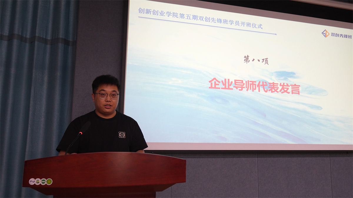 双创先锋班新学员代表段雅倩在发言中,她首先表达了自己作为新成员激动、期待与感激的心情——激动源于经过选拔加入充满活力的集体,期待开启创新学习之旅,感激则送给搭建平台的学校领导、筹备的老师和所有支持者。老学员代表郭佳承在发言中,首先感谢学校、创新创业学院及老师们的支持,让自己及学员们在平台上获得成长;接着分享自身经历,通过项目实践实现理论到价值的转化并获得千万级投资。