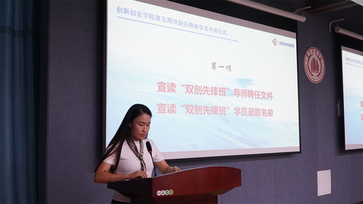 招生与就业指导处创业中心主任车丽芳宣读第五期“双创先锋班”导师聘任文件与学员录取名单。本期先锋班汇聚“产教双栖大咖”矩阵:既有深耕学术智库的商科教师,也有操盘百万项目的实战派导师,他们将全程嵌入学员培养全周期,从商业计划书打磨到融资路演,提供“理论+资源+人脉”的三维赋能。