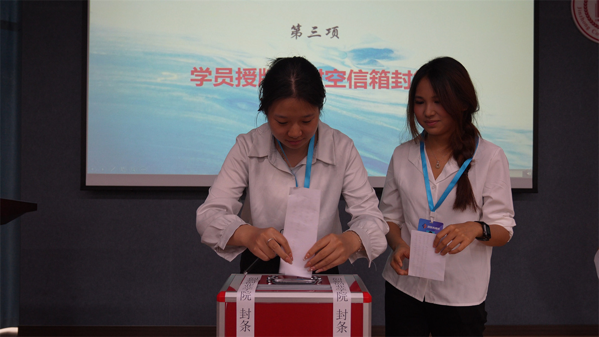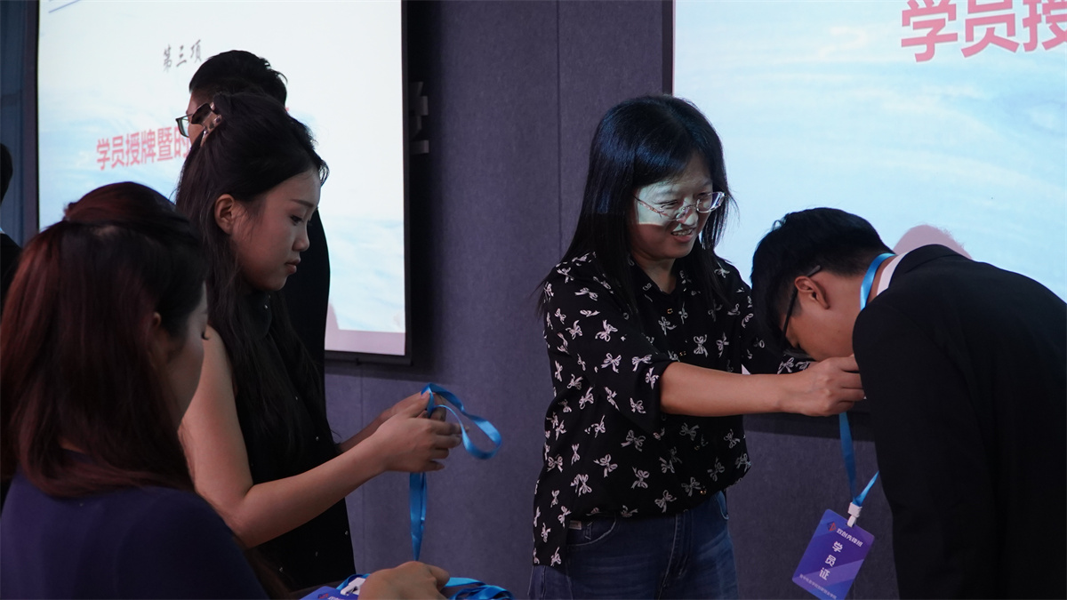 校长助理杨碧霞为学员逐一颁发第五期学员证。当佩戴好学员证,学员们的目光被一旁的“时空信箱”牢牢锁住——箱内铺着泛黄信纸,封口处印着“2025结业启封”的字样。笔尖划过信纸的沙沙声里,檀木香气的信封被郑重投入信箱,成为青春与未来的“双向契约”。