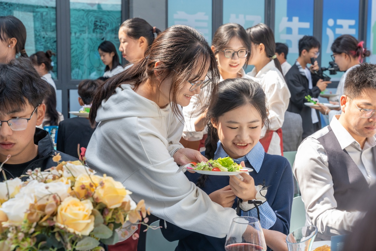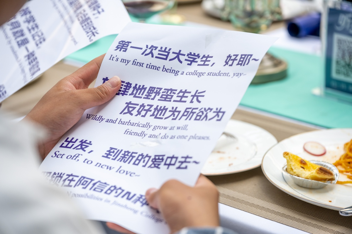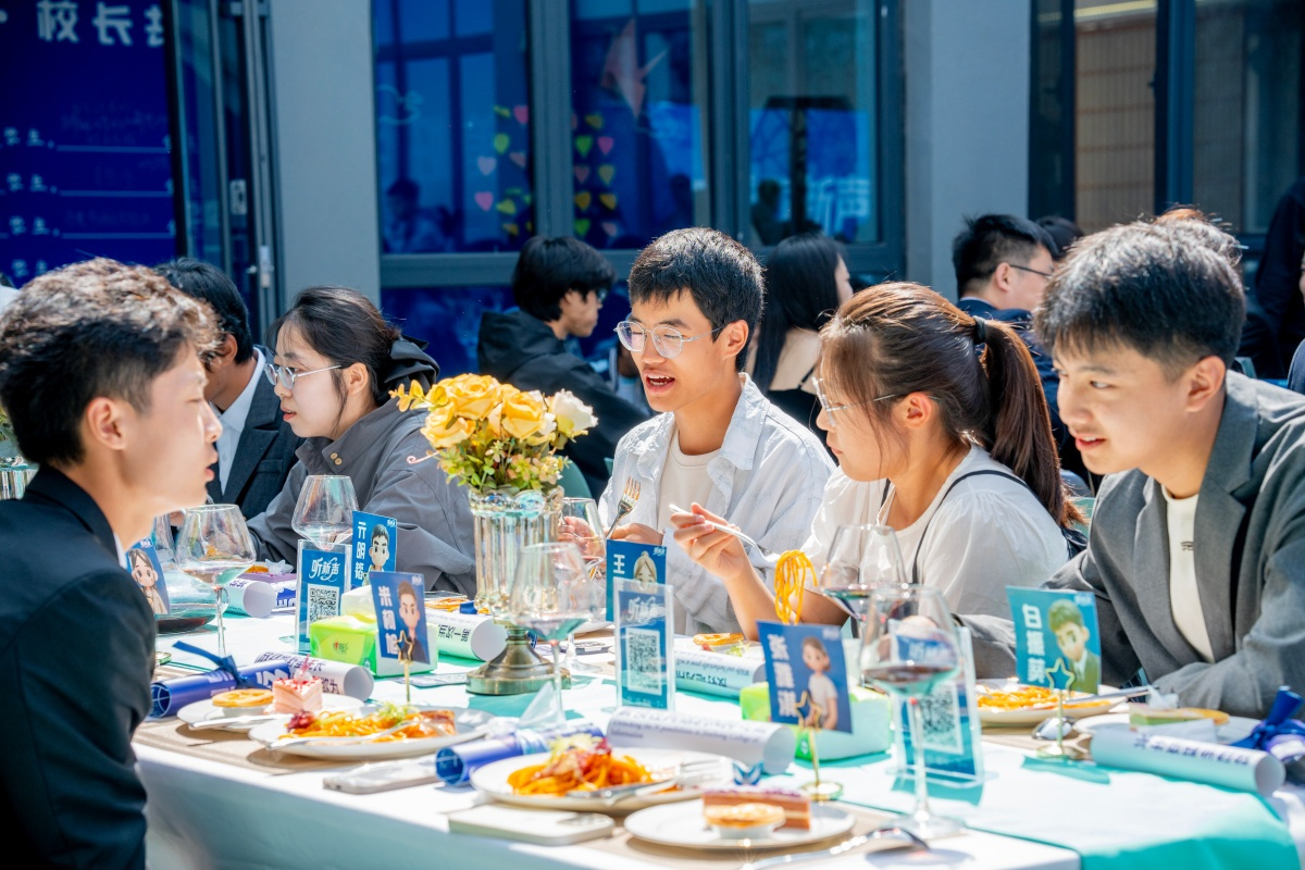 长桌铺开,青瓷餐具映着光影,钢琴曲《午后的旅行》缓缓流淌。交流环节中,老师们以轻松自然的方式,与新生们探讨成长与幸福的多重维度。