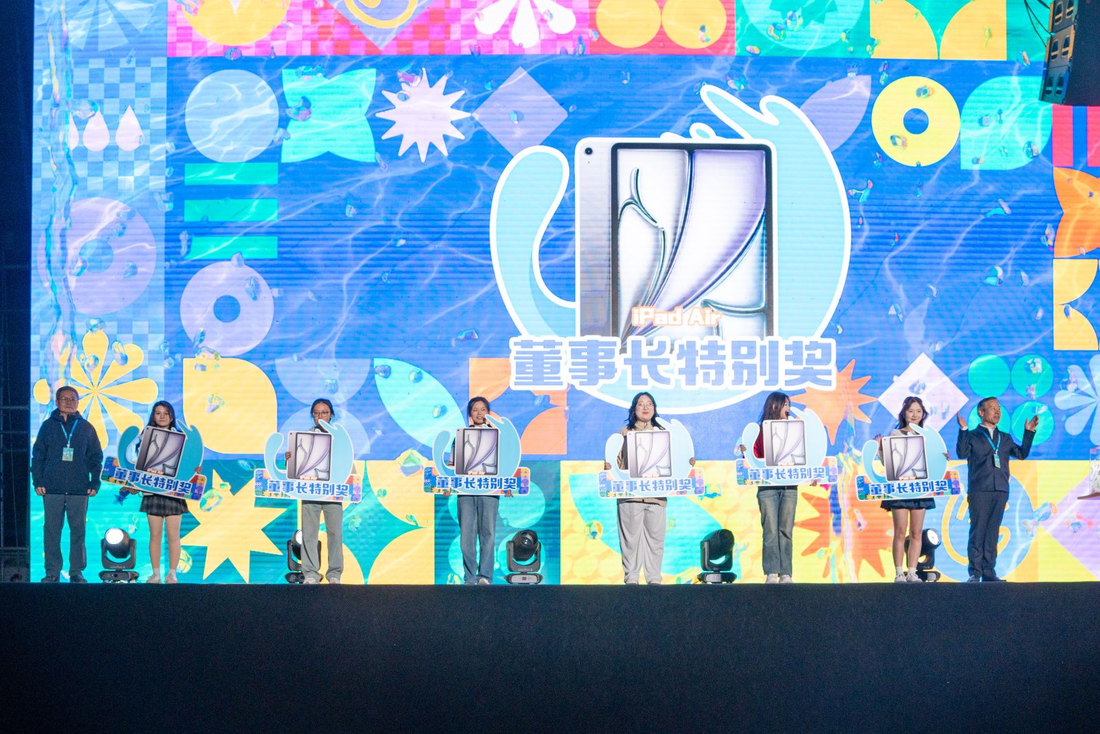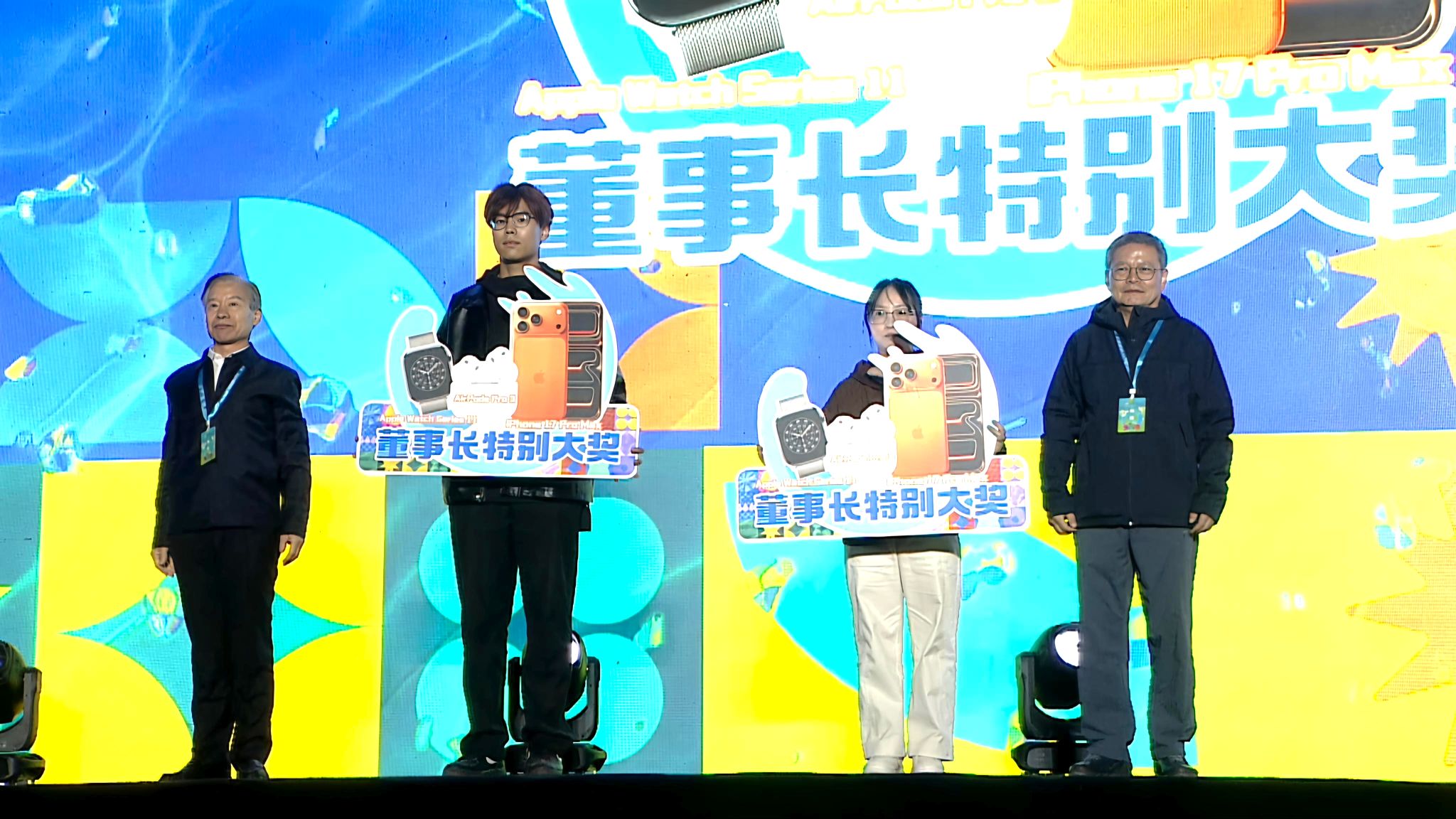 在热烈的氛围中,现场师生翘首以盼的“董事长特别奖”“董事长特别大奖”抽奖环节来袭,学校常务副校长胡继连从符合条件的教职工中抽出3名“董事长特别奖 教师序列”,他们分别获得iPad Air一台。学校党委书记张存伟、校长姬宇从符合条件的学生中抽出6名“董事长特别奖 学生序列”,他们分别获得iPad Air一台。张书记和姬校长从符合条件的学生中抽出今晚的2名压轴大奖,“董事长特别大奖”,他们的奖品是包含iPhone 17 Pro Max、Apple Watch Series 11、AirPods Pro 3三件套的豪华Apple大礼包一份。