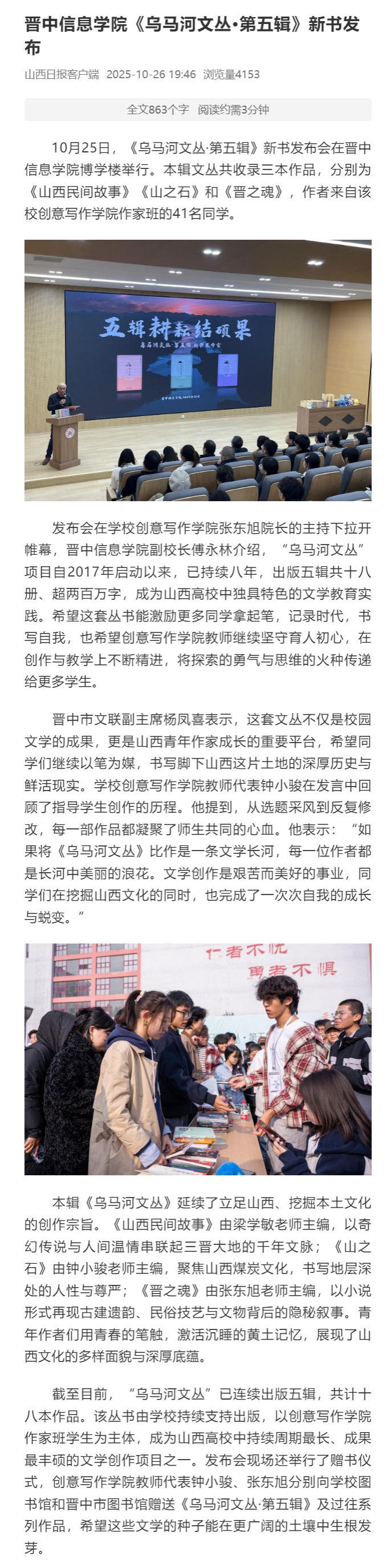 10月25日,《乌马河文丛·第五辑》新书发布会在晋中信息学院博学楼举行。本辑文丛共收录三本作品,分别为《山西民间故事》《山之石》和《晋之魂》,作者来自该校创意写作学院作家班的41名同学。