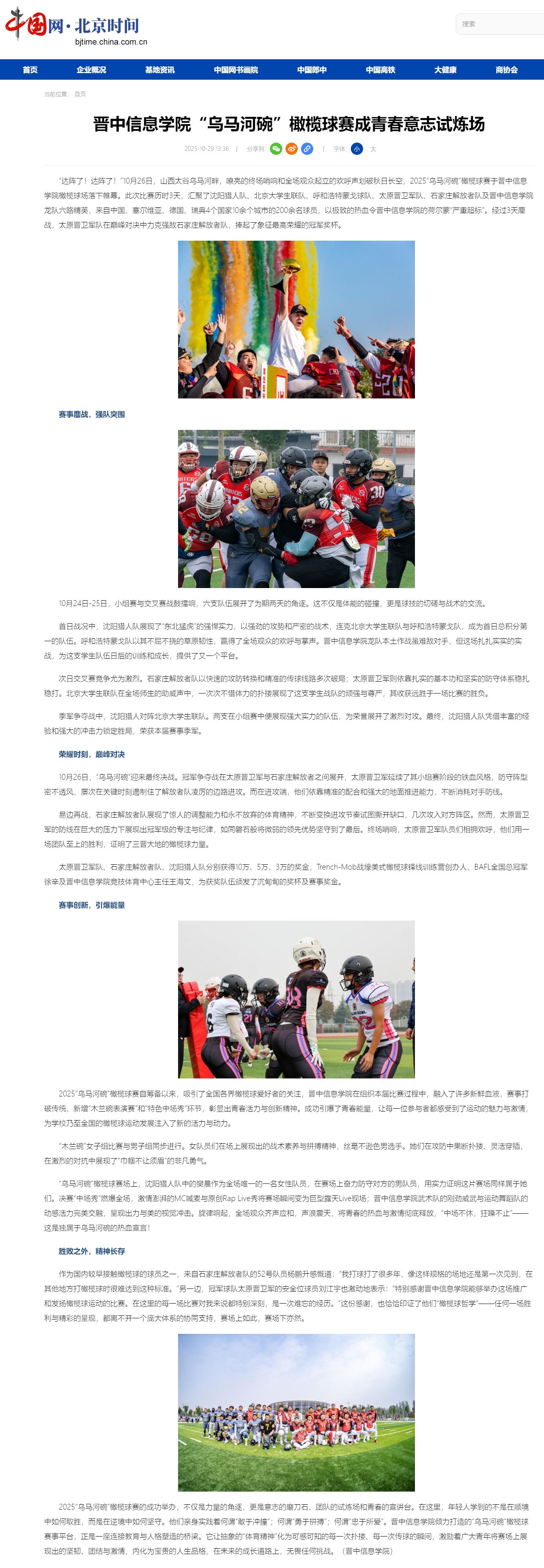 “达阵了!达阵了!”10月26日,山西太谷乌马河畔,嘹亮的终场哨响和全场观众起立的欢呼声划破秋日长空,2025“乌马河碗”橄榄球赛于晋中信息学院橄榄球场落下帷幕。此次比赛历时3天,汇聚了沈阳猎人队、北京大学生联队、呼和浩特蒙戈球队、太原晋卫军队、石家庄解放者队及晋中信息学院龙队六路精英,来自中国、塞尔维亚、德国、瑞典4个国家10余个城市的200余名球员,以极致的热血令晋中信息学院的荷尔蒙“严重超标”。经过3天鏖战,太原晋卫军队在巅峰对决中力克强敌石家庄解放者队,捧起了象征最高荣耀的冠军奖杯。