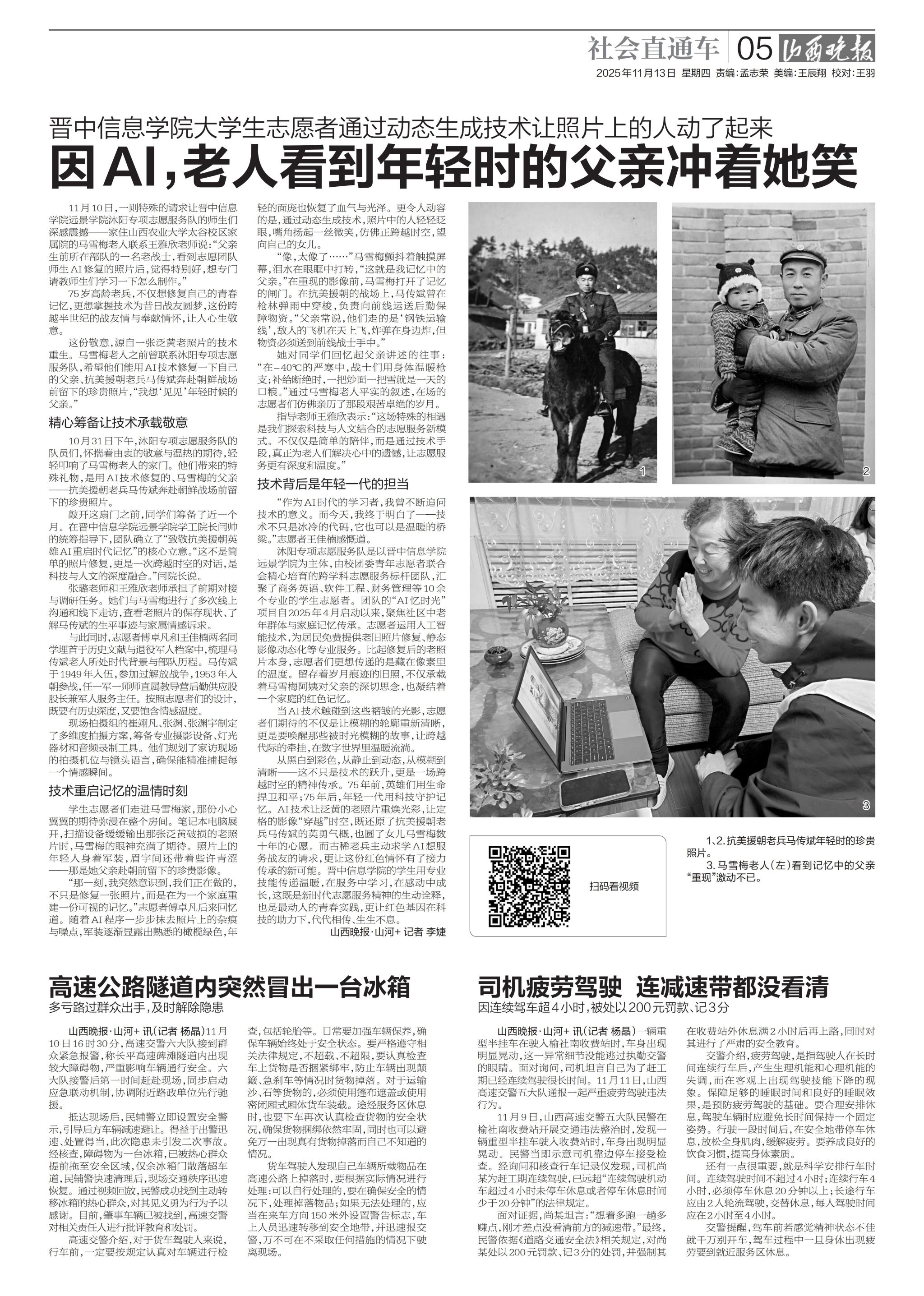 从黑白到彩色,从静止到动态,从模糊到清晰——这不只是技术的跃升,更是一场跨越时空的精神传承。75年前,英雄们用生命捍卫和平;75年后,年轻一代用科技守护记忆。AI技术让泛黄的老照片重焕光彩,让定格的影像“穿越”时空,既还原了抗美援朝老兵马传斌的英勇气概,也圆了女儿马雪梅数十年的心愿。而古稀老兵主动求学AI想服务战友的请求,更让这份红色情怀有了接力传承的新可能。晋中信息学院的学生用专业技能传递温暖,在服务中学习,在感动中成长,这既是新时代志愿服务精神的生动诠释,也是最动人的青春实践,更让红色基因在科技的助力下,代代相传、生生不息。