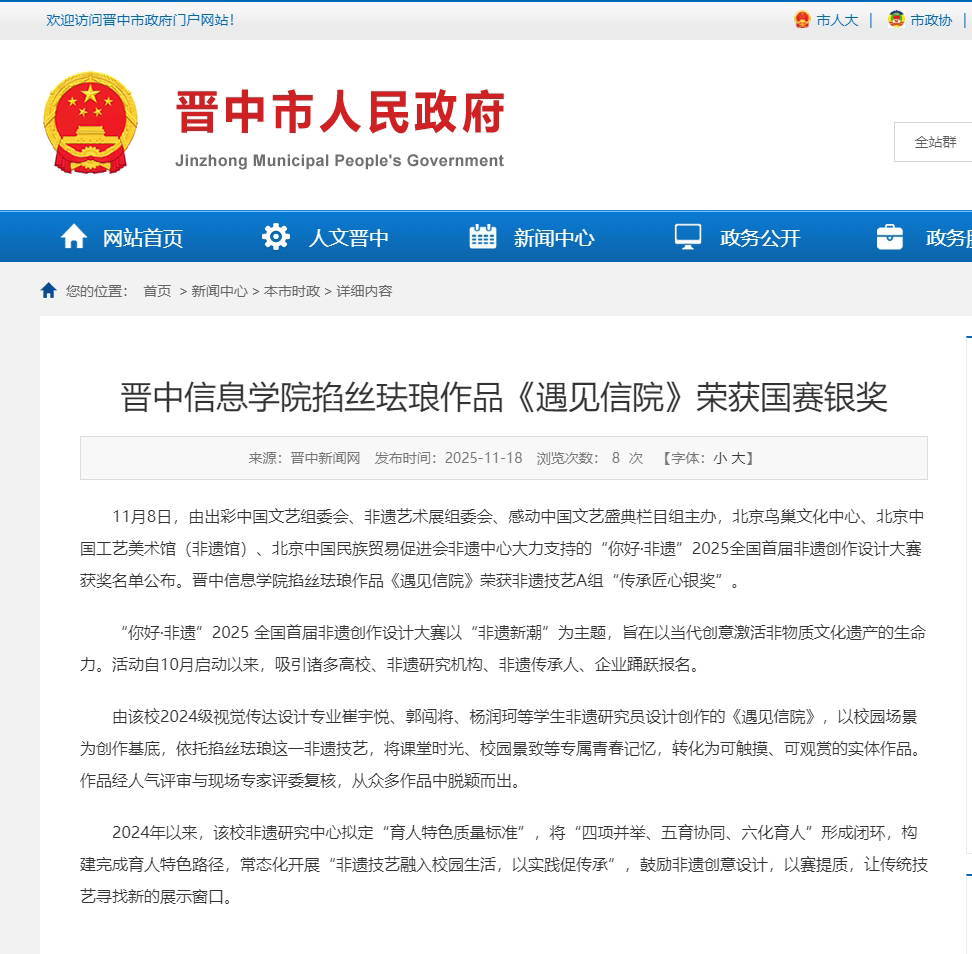 11月8日,由出彩中国文艺组委会、非遗艺术展组委会、感动中国文艺盛典栏目组主办,北京鸟巢文化中心、北京中国工艺美术馆(非遗馆)、北京中国民族贸易促进会非遗中心大力支持的“你好·非遗”2025全国首届非遗创作设计大赛获奖名单公布。晋中信息学院掐丝珐琅作品《遇见信院》荣获非遗技艺A组“传承匠心银奖”。