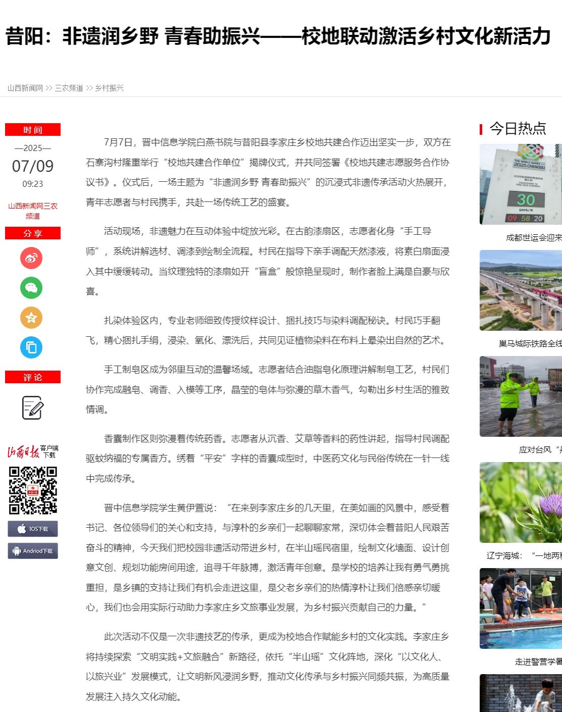 7月7日,晋中信息学院白燕书院与昔阳县李家庄乡校地共建合作迈出坚实一步,双方在石寨沟村隆重举行“校地共建合作单位”揭牌仪式,并共同签署《校地共建志愿服务合作协议书》。仪式后,一场主题为“非遗润乡野 青春助振兴”的沉浸式非遗传承活动火热展开,青年志愿者与村民携手,共赴一场传统工艺的盛宴。