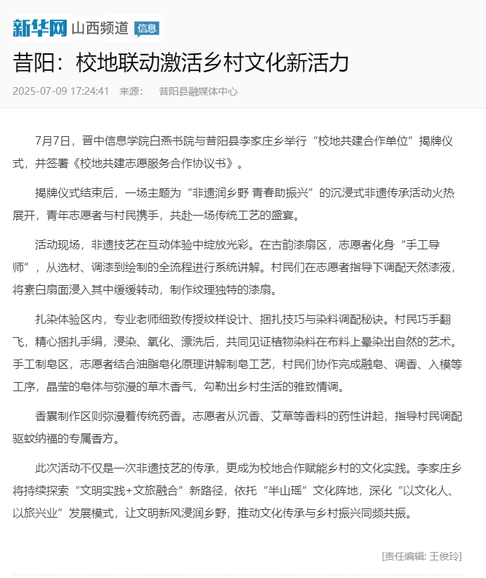 7月7日,晋中信息学院白燕书院与昔阳县李家庄乡举行“校地共建合作单位”揭牌仪式,并签署《校地共建志愿服务合作协议书》。
