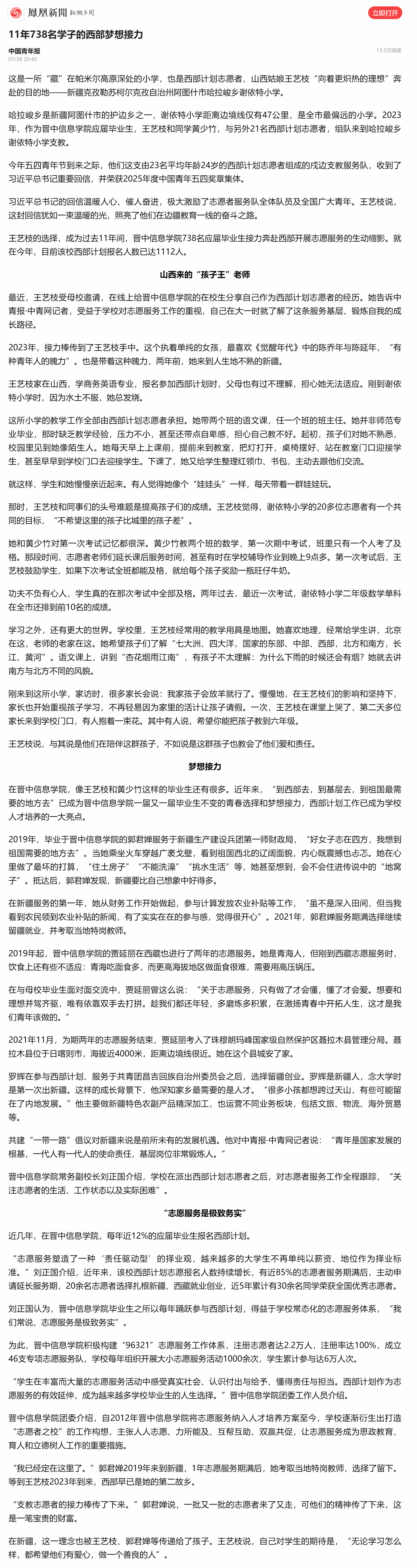 王艺枝的选择,成为过去11年间,晋中信息学院738名应届毕业生接力奔赴西部开展志愿服务的生动缩影。就在今年,目前该校西部计划报名人数已达1112人。