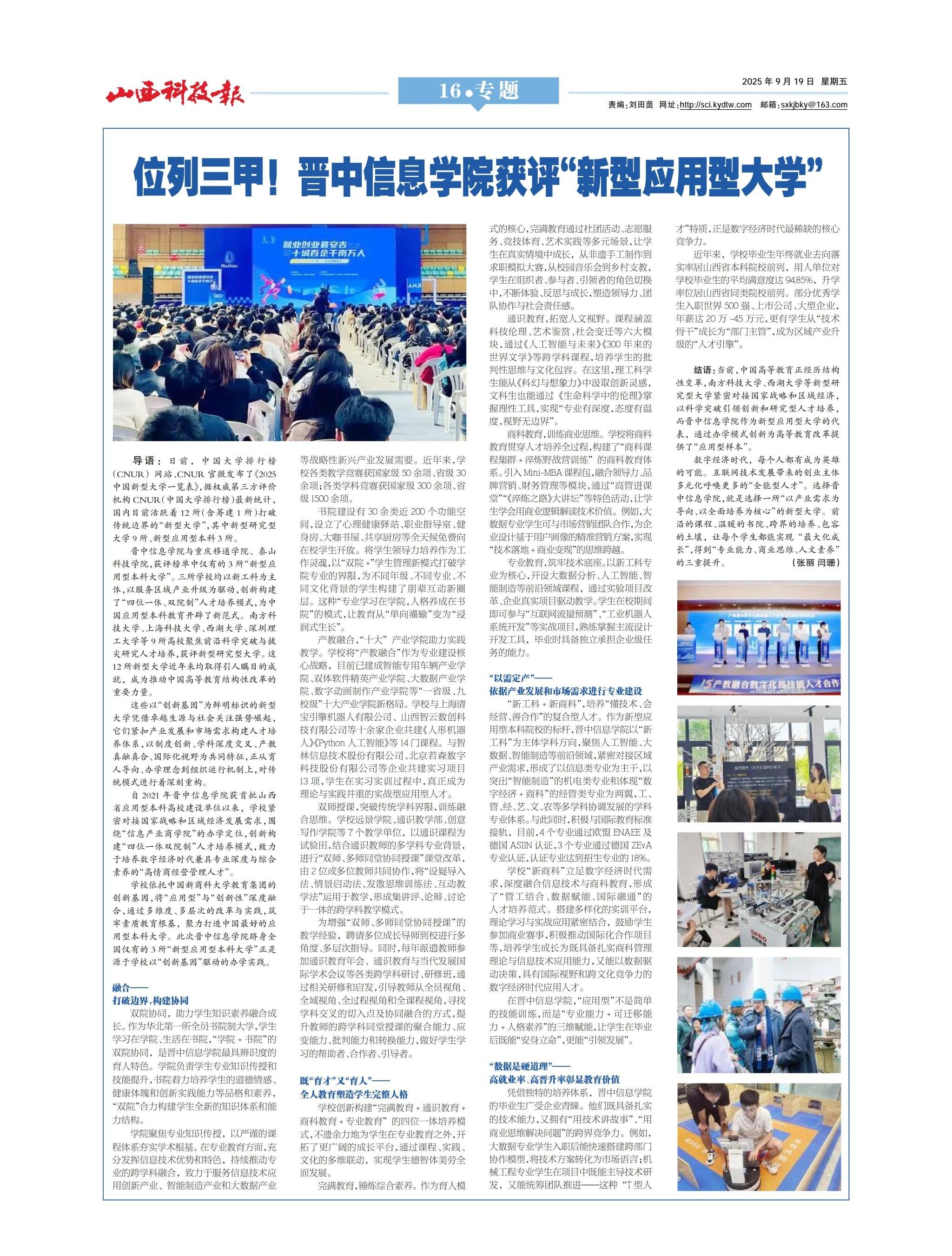 当前,中国高等教育正经历结构性变革,南方科技大学、西湖大学等新型研究型大学紧密对接国家战略和区域经济,以科学突破引领创新和研究型人才培养,而晋中信息学院作为新型应用型大学的代表,通过办学模式创新为高等教育改革提供了“应用型样本”。