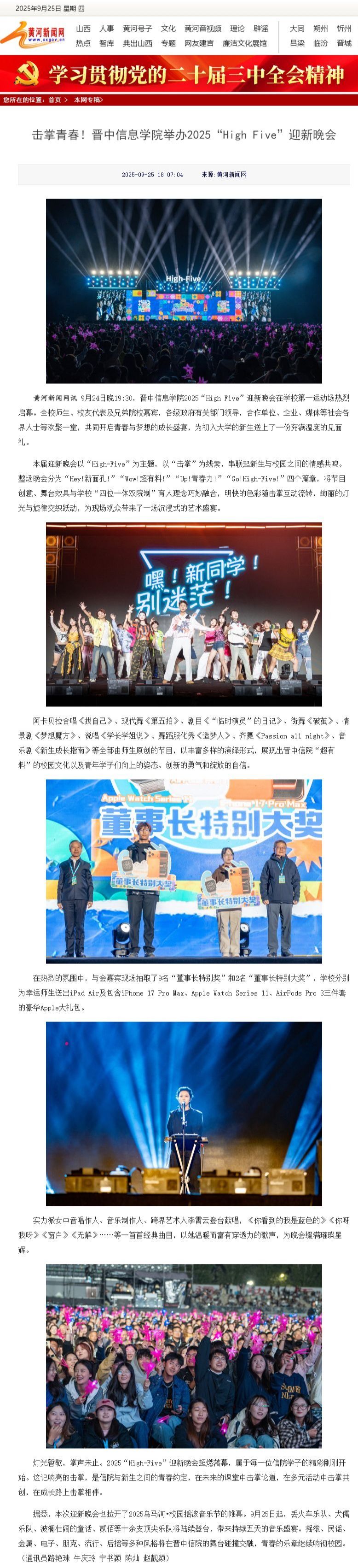 黄河新闻网讯9月24日晚19:30,晋中信息学院2025“High Five”迎新晚会在学校第一运动场热烈启幕。全校师生、校友代表及兄弟院校嘉宾,各级政府有关部门领导,合作单位、企业、媒体等社会各界人士等欢聚一堂,共同开启青春与梦想的成长盛宴,为初入大学的新生送上了一份充满温度的见面礼。