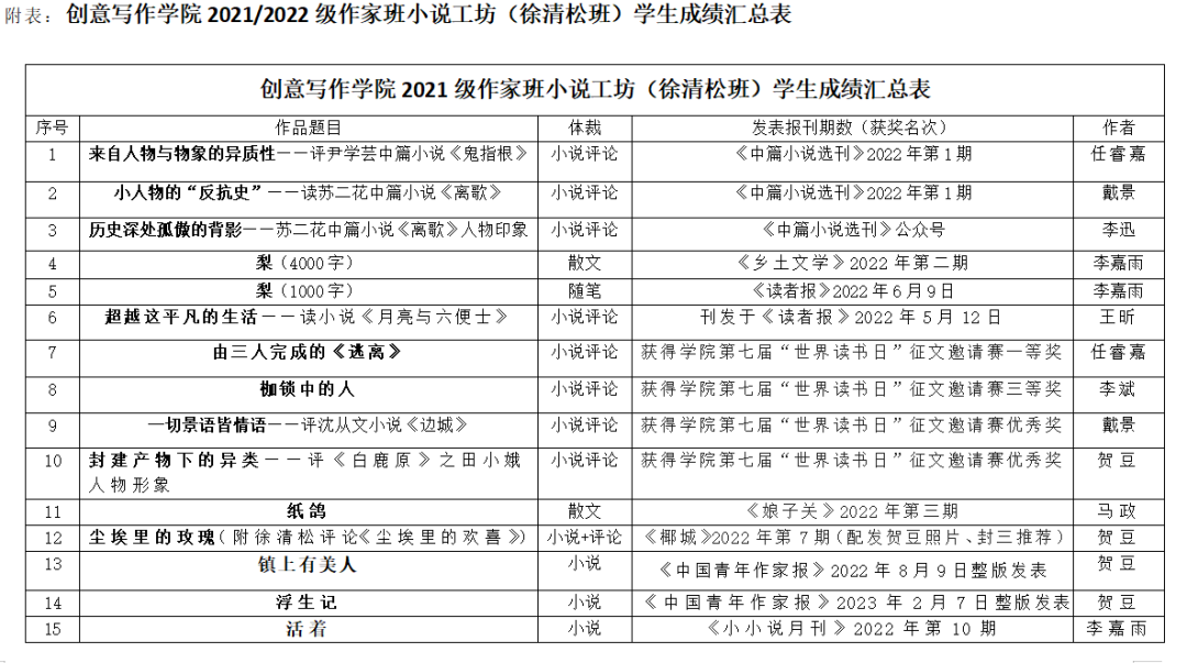 正如徐老师说过的:“学生发表作品是我最开心的事”,纵观徐老师这两年来的教学成果,作家班学生发表文学作品是最耀眼的存在,学生发表作品共计30篇左右,体裁涵盖小说、小说评论、散文、随笔。张佳荣、贺豆、任睿嘉、马政、韩慧媛、戴景……这些同学如同千里马遇伯乐,与作家班互相成就,他们的经历和作品也鼓舞着作家班其他同学潜心创作,打磨精品,让星光继续闪耀。