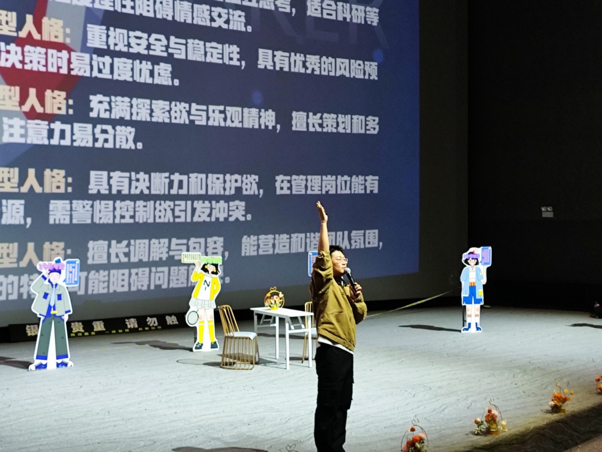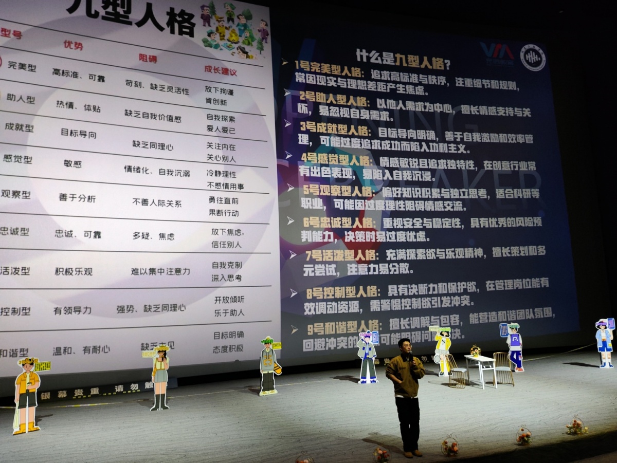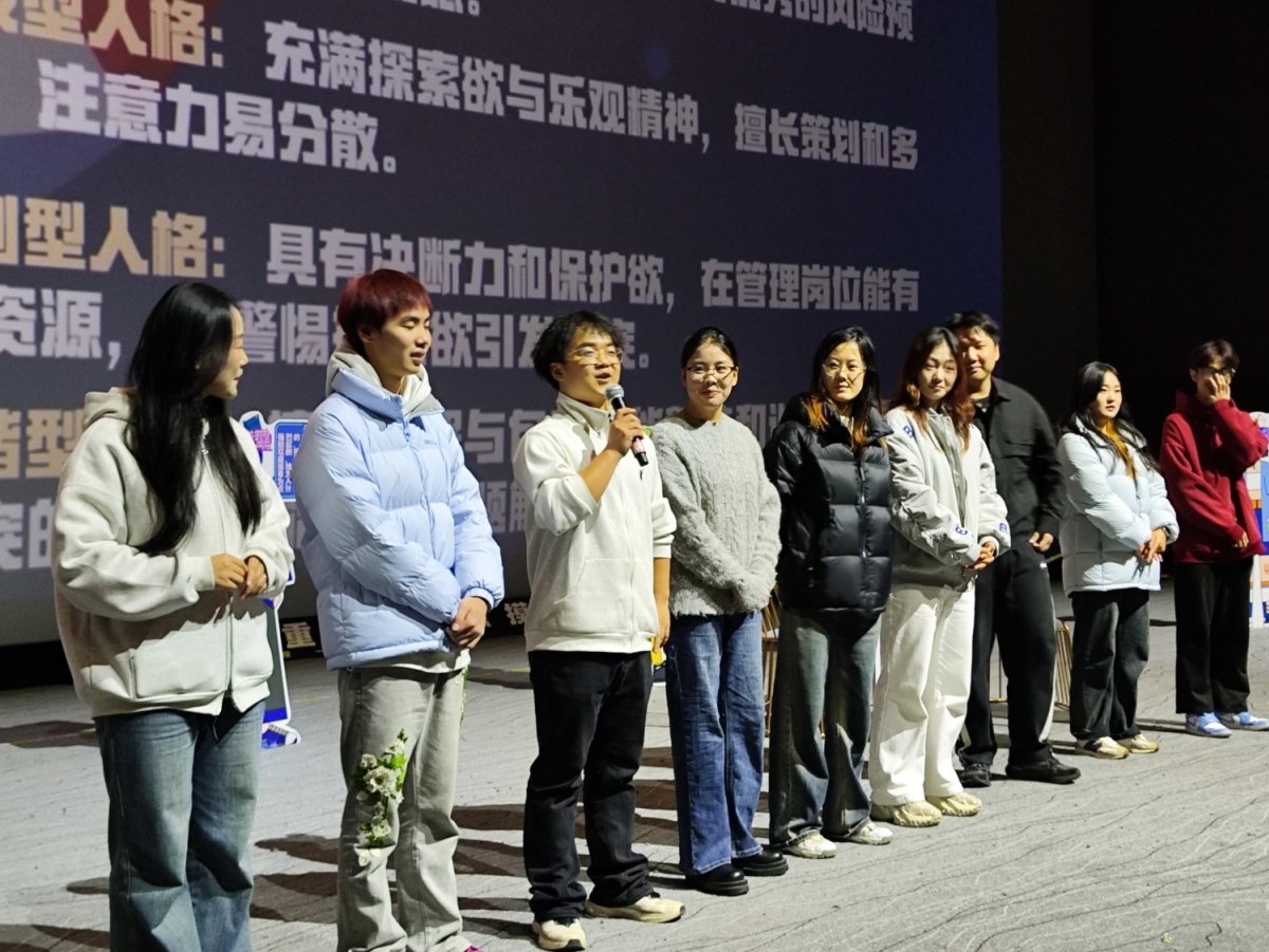 活动开篇,辅导员崔嘉源老师便以“完满人格”为切入点,拆解了完满人格是依据思维模式、情绪反应和行为习惯进行分类,将人格划分为九种基本类型——从“高标准高秩序的1号完美型”到“调解与包容的9号和平型”。前期通过问卷调研,已精准梳理出同学们多样的人格倾向,随后来自不同人格类型的“代言人”陆续登台,大家分享着日常学习中的思维习惯与处事方式,打破了“人格标签”的刻板印象。