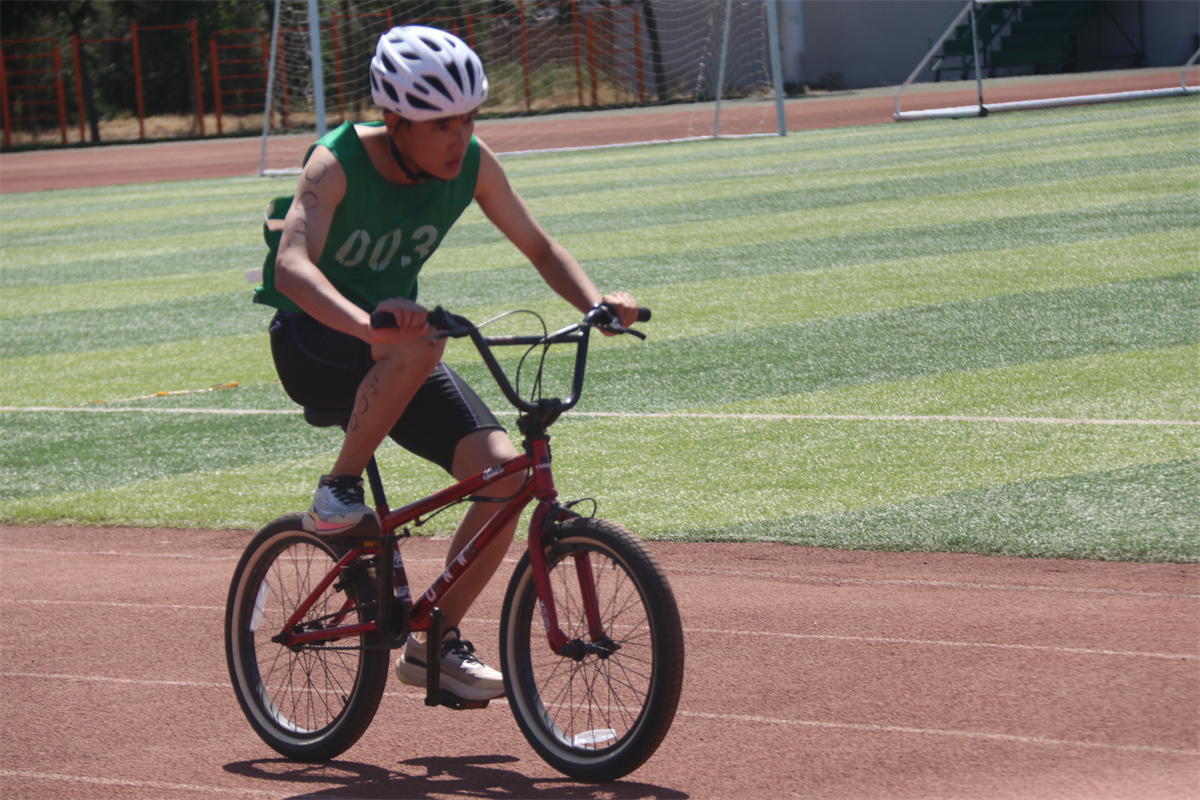 上岸后,选手们迅速奔向换项区,以最快的速度完成装备更换,随即跨上自行车,开启骑行项目。骑手们如疾风般冲出起点,车轮飞速转动,在赛道上疾驰。他们俯身压低身体,减少风阻,全神贯注地向前骑行。选手们在直道上全力冲刺,风声在耳边呼啸;在弯道处,他们精准控车,车身几乎贴近地面,划出优美的弧线。男子竞技组的刘晓川、周世光、韩佳康三位选手实力强劲,始终处于领先集团,他们彼此紧盯,互不相让,其他选手也不甘示弱,奋力追赶,整个骑行赛道上充满了紧张激烈的竞争氛围。
