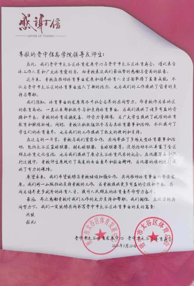 4月1日,我校收到了来自晋中市太谷区体育发展中心和晋中市太谷区体育总会的一封充满赞誉的感谢信,以表彰我校学生在晋中市太谷区2023-2024羽毛球联赛中的优异表现。