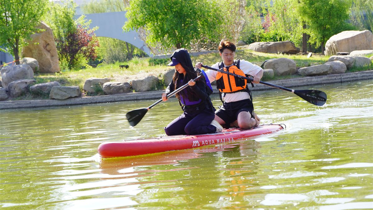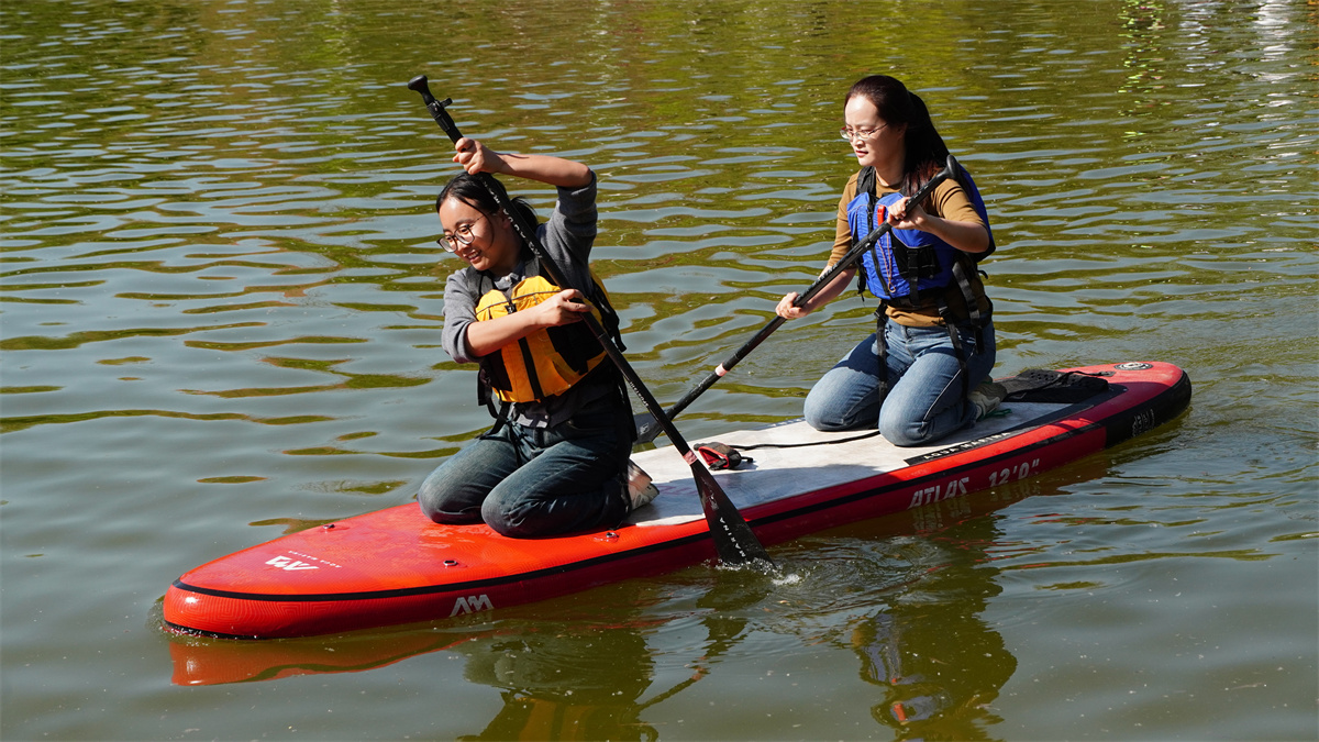 乘风破浪水上竞技则上演了多场“水上大戏”:面对双人桨板难以保持平衡和方向的问题,老师们不断转着圈,紧握手中的桨,努力保持着平衡。桨板摇晃,搭档们手忙脚乱地保持平衡。“左!右!”的指令此起彼伏,有人跪着划水,有人认为蹲着最容易保持平衡。还有两位老师竟背对背坐着划桨,在湖心打转引起全场爆笑! 最终,机关三组组凭借良好的平衡感夺得乘风破浪的冠军!