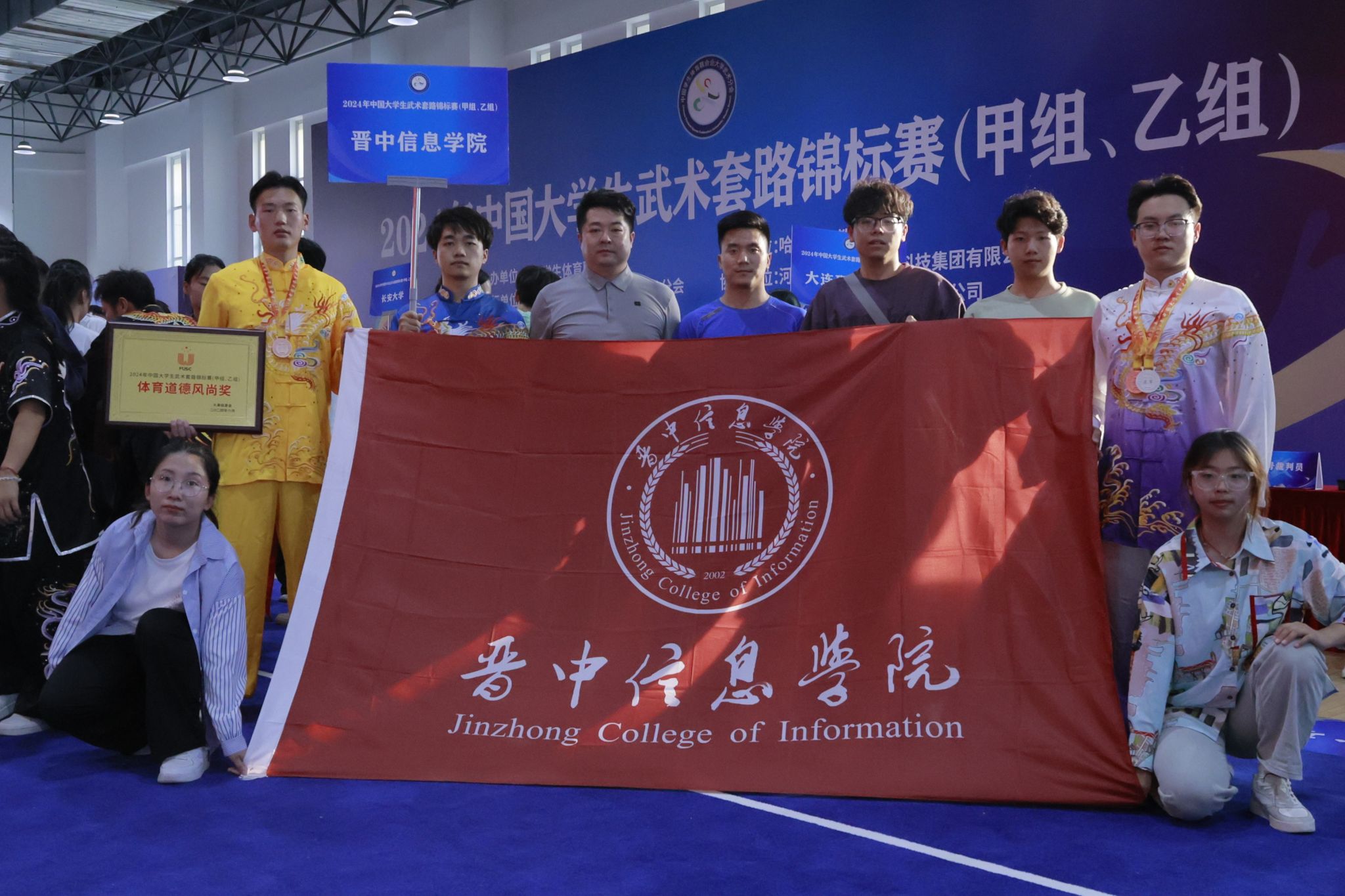 在激烈的比赛期间,队员们充分展现了卓越的体育道德和高尚的精神风貌。他们以优雅而飘逸的身姿、稳健而矫健的步伐,以及一系列令人惊叹的精湛动作,彰显出信院运动健儿特有的青春活力和不屈的坚韧精神。经过精彩的角逐,最终王乐同学获得八极拳第三名和形意鳞角刀第二名,李欣欣同学获形意拳第三名,田鹏煜同学获形意鳞角刀第四名的优异成绩,我校武术队荣获“体育道德风尚奖”。