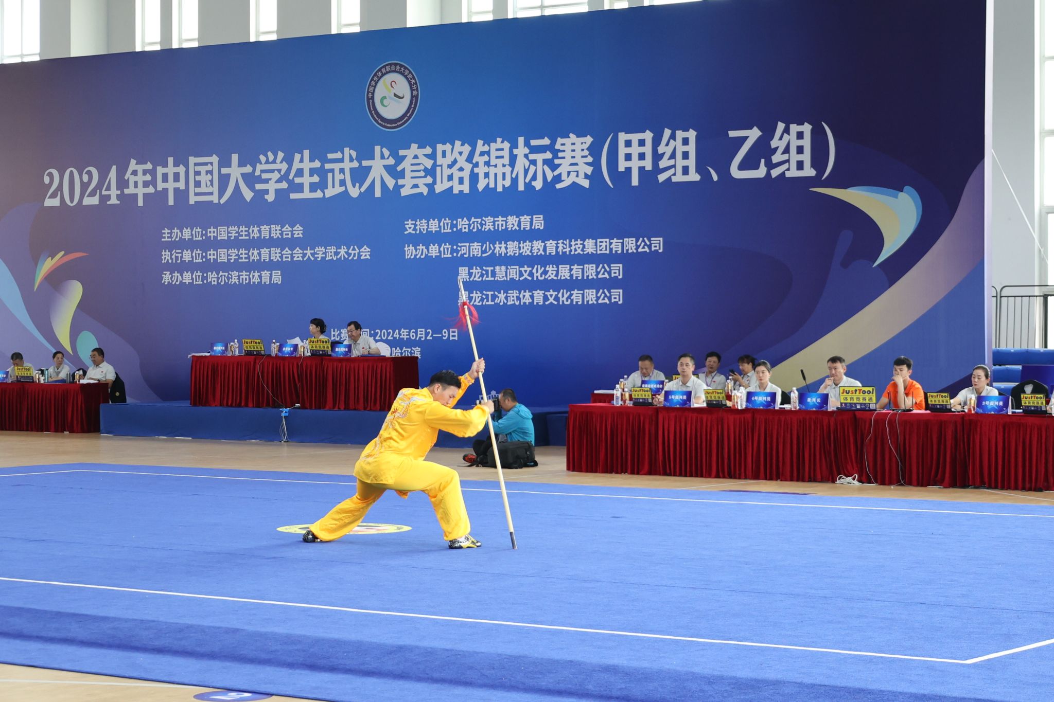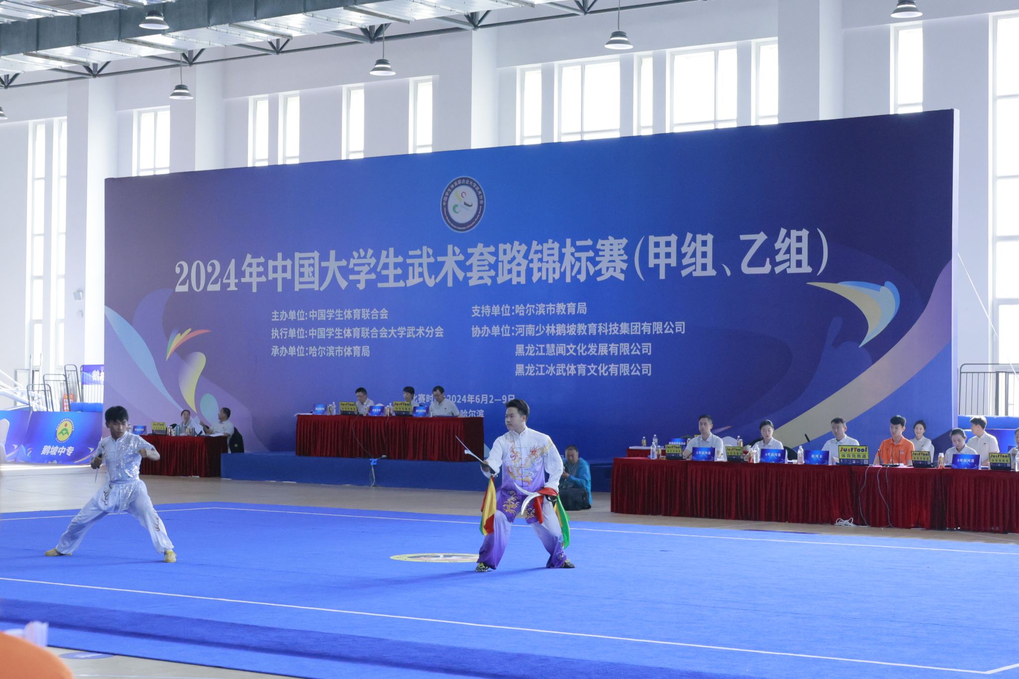 青春与激情在刀光剑影中交织成一幅生动的画卷,在这充满朝气的季节里,他们怀揣着无畏的勇气,勇敢地迎接挑战,展开了一场激动人心的武术竞技。6月4日-9日,由中国学生体育联合会主办,中国学生体育联合会大学武术分会执行、哈尔滨市体育局承办的2024年中国大学生武术套路锦标赛在哈尔滨华德学院体育馆举办,来自全国275所高校的1600余名运动员和武术爱好者汇聚于此,展示当代青年学子的飒爽英姿,尽显中华武术的风采与魅力。