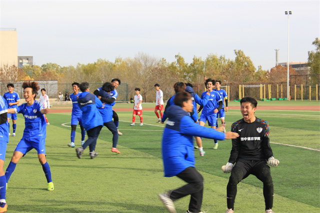 晋中信院男足以小组头名晋级,面对球队伤病太多的情况,队员们咬牙坚持,点球大战每一轮都扣人心弦,门将神勇扑出关键一球,最终以4:3险胜!