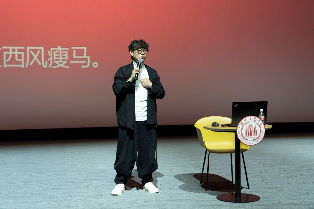 艺术相连,破界共生,胡乐民老师以独特视角,深度诠释了表达力在艺术领域的无限可能。他以李小龙“用水的方式表达自我”为切入点,巧妙融合道家“水利万物而不争”的哲学思想,将传统智慧与表达美学跨界联结,展现了表达力背后深厚的文化底蕴。为让同学们直观感受表达艺术的魅力,胡乐民老师播放了《满江红》演诵片段。视频中,舞台上“五花大绑”的创意设计,配合“驾长车踏破贺兰山缺”的激昂嘶吼,将话剧的戏剧张力、戏曲的身段韵味与诵读的豪迈气势完美融合。这种突破性的艺术呈现,让在场师生身临其境,现场掌声经久不息。在解析表达艺术的过程中,胡乐民老师以长征题材作品《半截皮带》为例,层层拆解其中的艺术处理,生动诠释了表达的最高境界——分寸的艺术。随后,他即兴演绎岑参的《白雪歌送武判官归京》,通过声线的抑扬顿挫,将“忽如一夜春风来”的豪迈与“山回路转不见君”的怅惘表现得淋漓尽致,为同学们勾勒出一幅气势恢宏的边塞诗画。胡乐民老师用精彩的演绎证明:真正的表达绝非单一技艺的展示,而是人生阅历、美学修养与精神信念的交响共鸣。表达如同流水,遇方则方,遇圆则圆,需要调动全感官的协同共振,方能实现艺术表达的至臻境界。