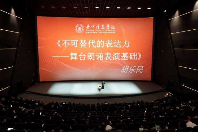 26日下午14:30,胡乐民老师于巨幕影院1号厅为师生带来《不可替代的表达力》主题讲座。这场融合艺术哲思与实践智慧的分享,犹如打开一扇通往语言艺术殿堂的大门。从执笔临帖的墨香浸染童蒙岁月,到话剧舞台的唱念做打磨砺形体,再到声乐殿堂的声腔雕琢淬炼音韵,胡乐民用半生积淀印证:真正的表达是生命能量的全维绽放。他将书法中锋行笔的筋骨、武术吐纳间的气韵、戏曲程式化的神髓熔铸一炉,在朗诵与演诵的边界反复叩击,最终淬炼出"每个字词都应是跃动的生命符码"这一独特的美学认知。其独创的演诵体系不仅打破了语言表达的平面桎梏,更以"艺术通感"为钥,开启了贯通文化课与艺术特长的教育新境。
