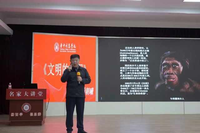 晚19:00,顾老师与广大师生相聚于图书馆小礼堂,共同开启一场以《文明的历程》为主题的讲座。当人类文明的长河跨越百万年时空,其演进的底层逻辑与核心脉络始终是探寻的核心。语言文字的根基到科学人文的共生,从农耕文明的跃迁到文艺复兴的本质,顾老师以丰富的文化底蕴为听众勾勒出一幅宏大而精微的人类文明演进图景。