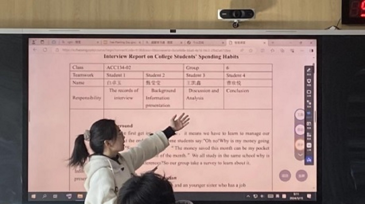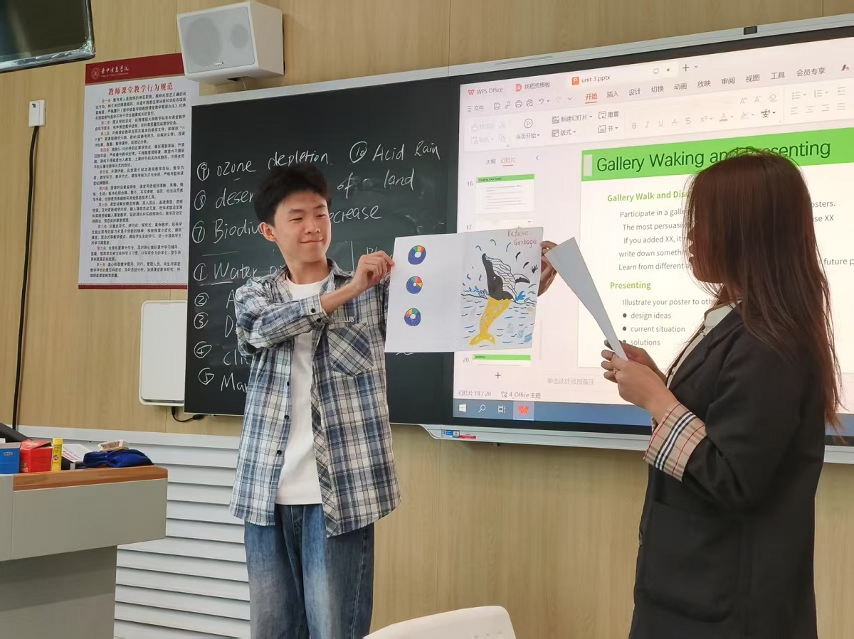 注重“做”的项目学习,倡导沟通和合作。教学不仅关注兴趣,更注重通过多样化的实践训练切实发展学生的英语学习能力,提升语言应用能力。学生以小组合作形式完成项目任务,如围绕“大学生消费习惯”开展英文访谈、数据分析和汇报展示。李静芳老师组织学生调研环保问题并制作英文海报,有效锻炼了学生的沟通技巧、团队合作能力、批判性思维和问题解决能力。