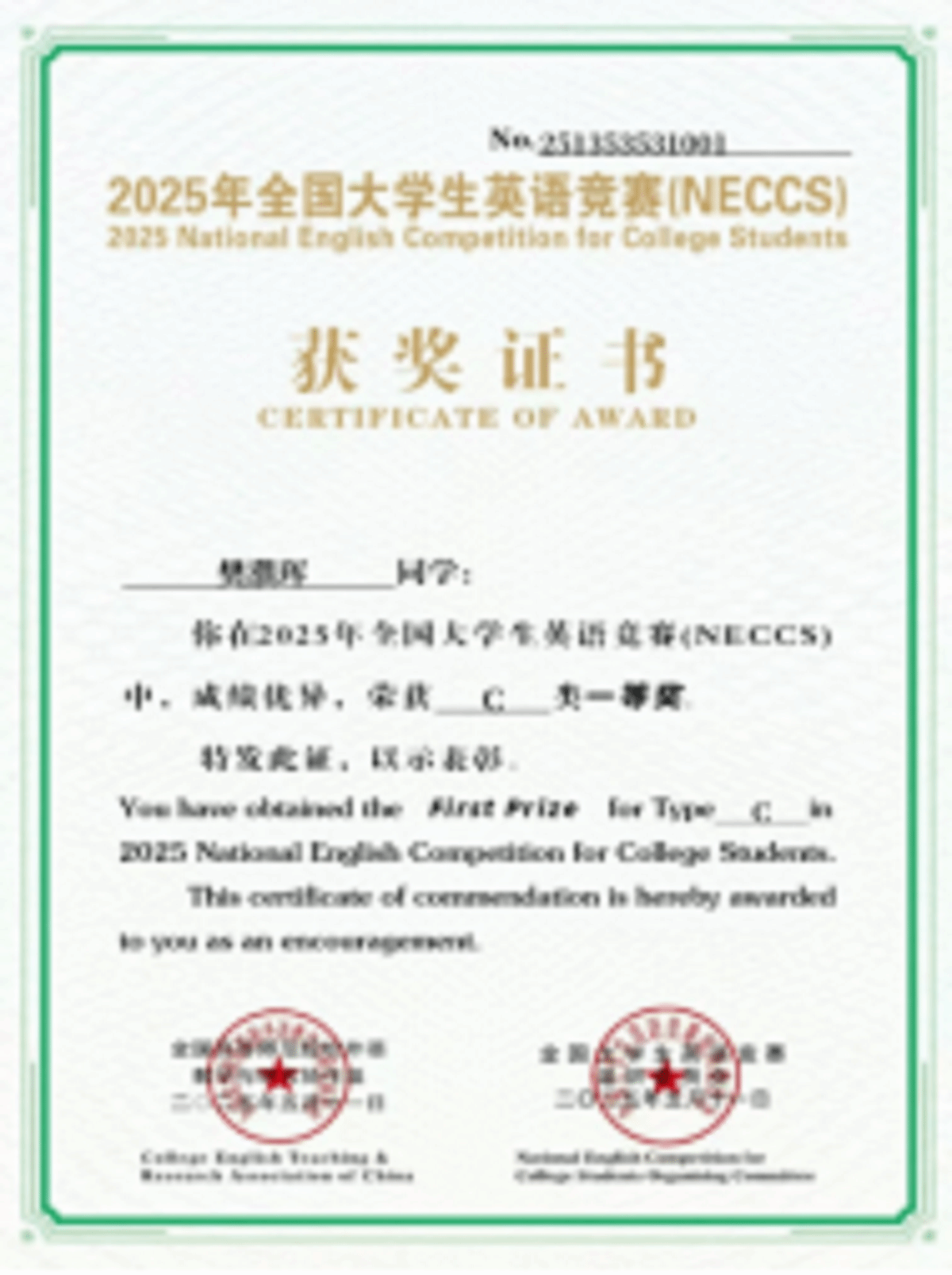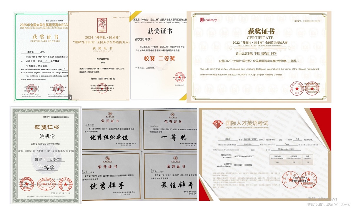 鼓励“赛”的朋辈互鉴,培育卓越和荣誉。远景学子积极投身各类英语竞赛,如“大学生英语能力大赛”、“国才杯”系列赛事、“讲述中国”写作大赛等。这些赛事和平台为他们提供了展示语言风采的机会。在同学们的不懈努力和教师的悉心指导下,远景学子屡获佳绩,在收获荣誉的同时也赢得成长,提升了自信心、展现了舞台风采、锻炼了应变能力。
