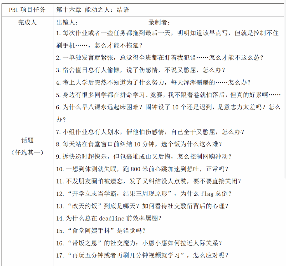 在《心理学导论》的第十六章“能动之人”学习中,同学们不再局限于课本知识,而是通过PBL项目式学习方式,将心理学原理与日常生活紧密结合。本次课堂实践要求各小组从给定的现实话题(如拖延、手机依赖、冲动消费等)中选取一个,深入分析其背后的心理学机制,并提出科学、实用的应对策略,最终以心理学科普视频的形式呈现成果。