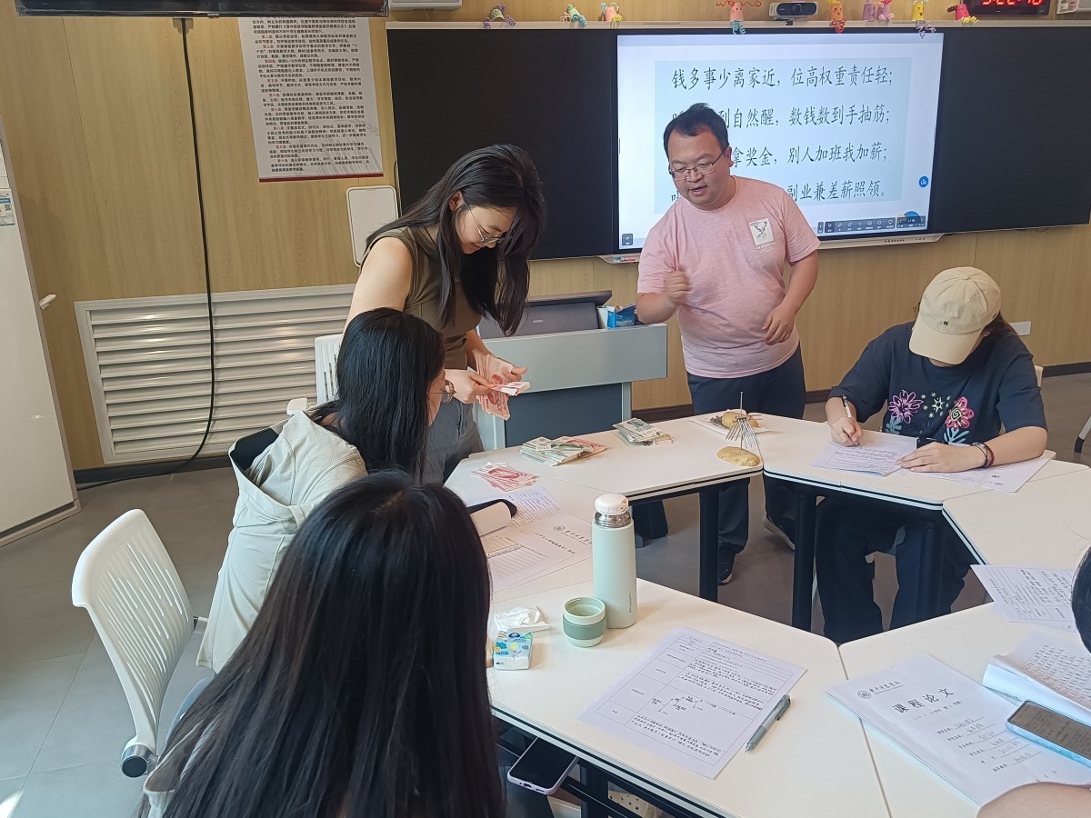杨瑞老师则从行为经济学视角出发,带领学生体验了“马铃薯插钉子”实验。同学们通过亲手操作,直观感受到“禀赋效应”中人们对拥有物的非理性高估以及“平衡”在决策中的重要性。随后的“数钞识价值”环节,学生需在限定时间内清点不同面额纸币,借此反思“时间成本与货币价值”的权衡关系。杨老师指出:“行为实验是打破认知偏见的钥匙。”