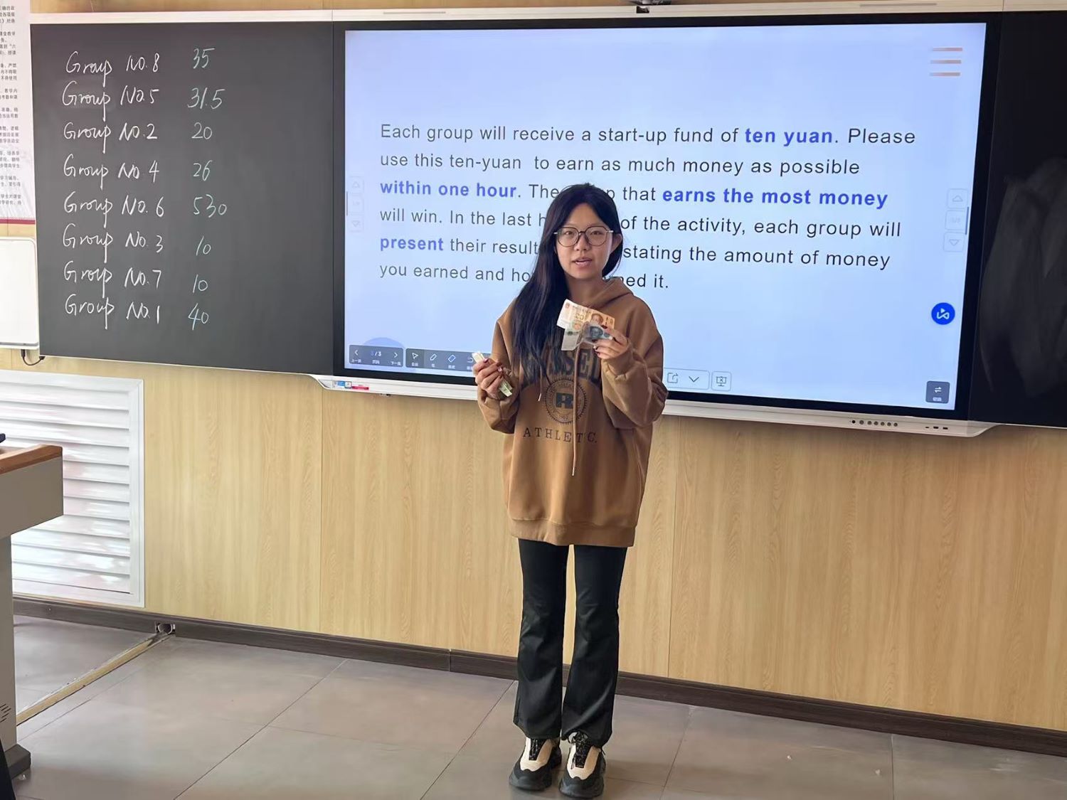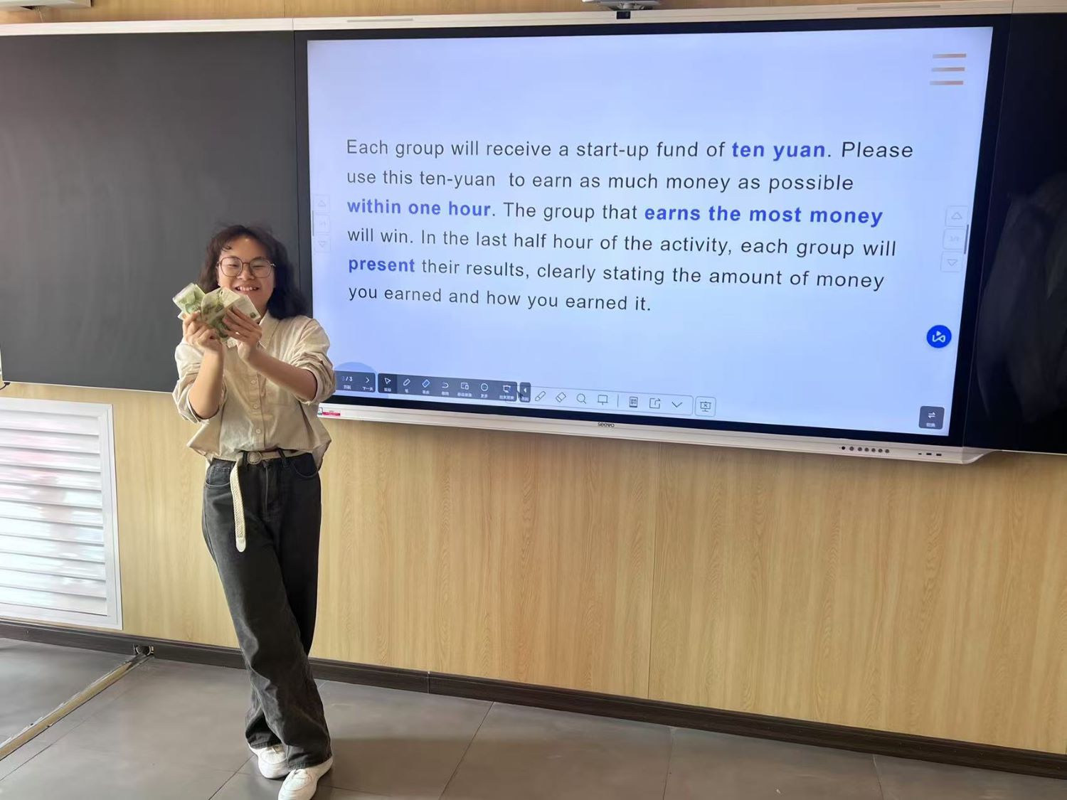 在这次实践活动中,平静老师将全班同学分为了8个小组,并为每个小组提供了10元的启动资金。她要求学生们在一个小时内,利用这些资金在校园内赚到更多的钱。结束后,每组需要上台进行三分钟的展示,分享他们是如何做到的。