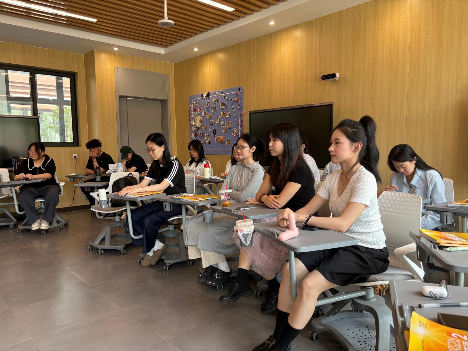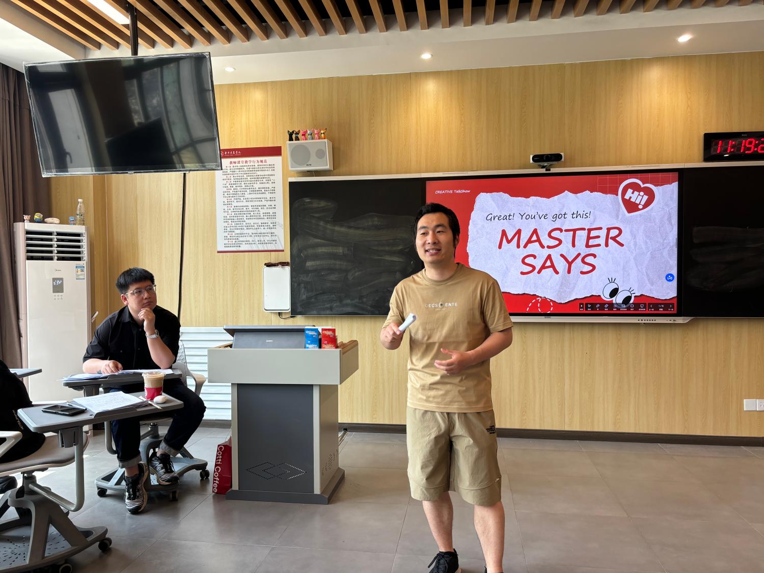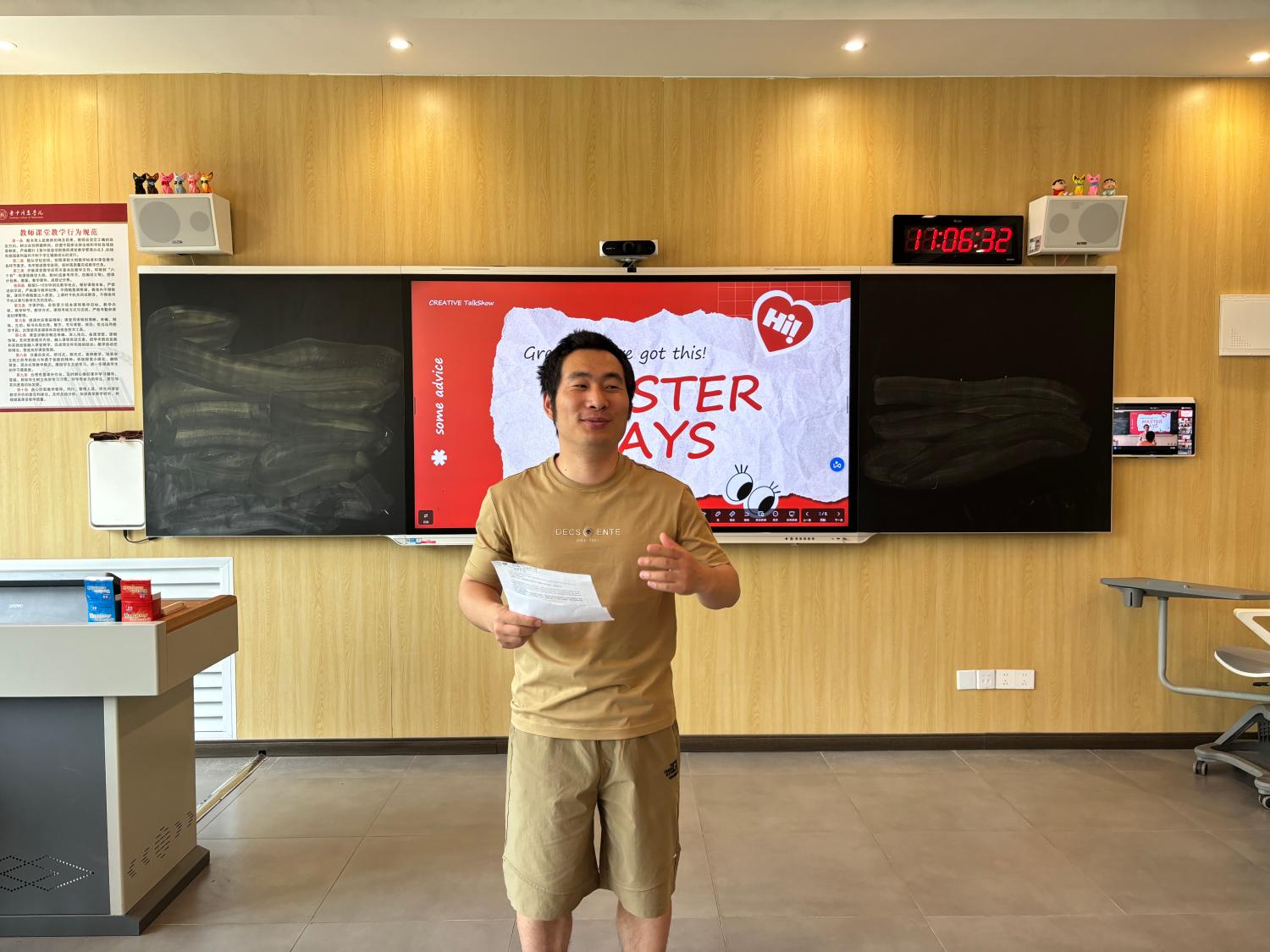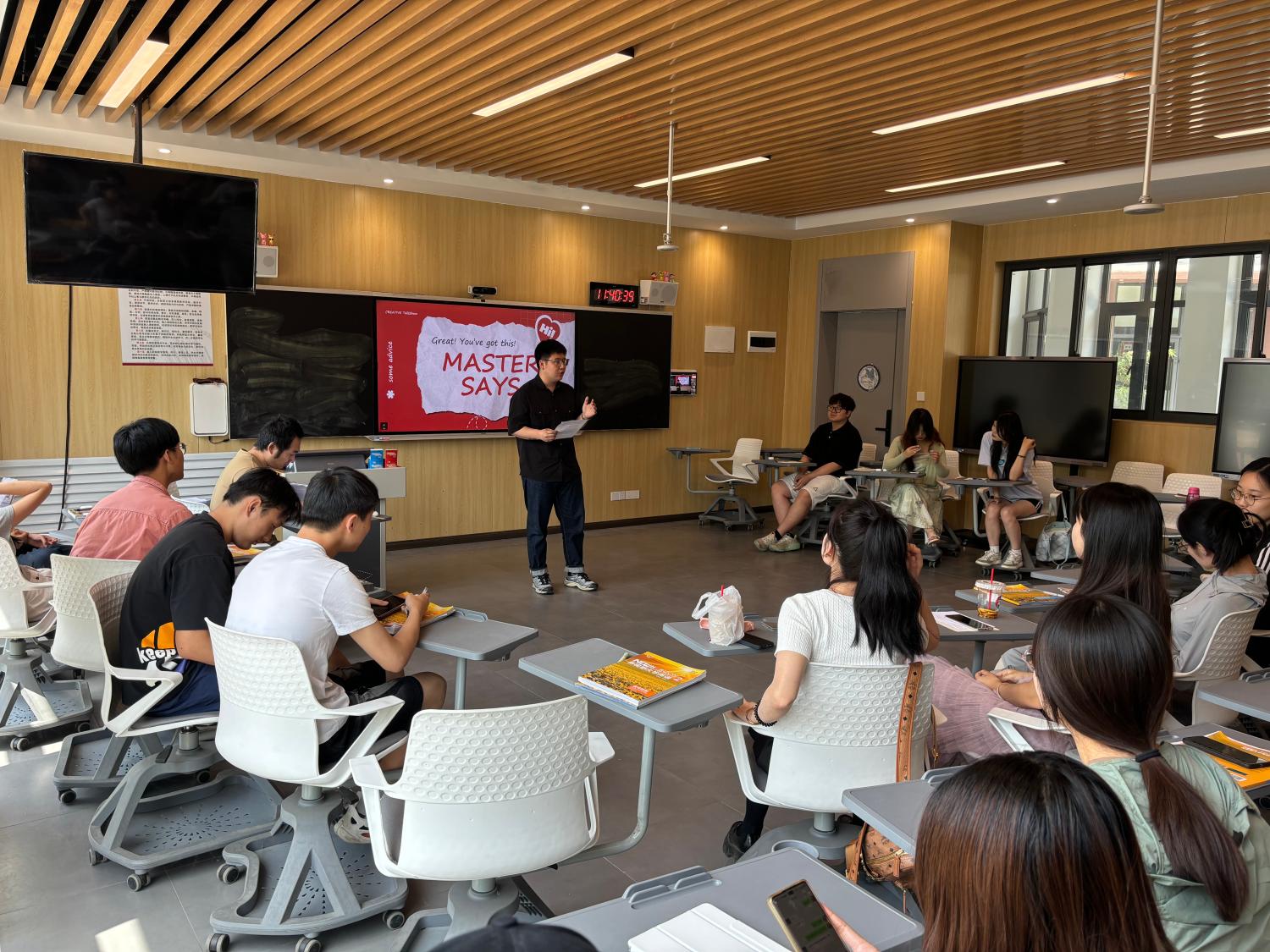 刘老师掏出多年喜剧笔记“当年我英文水平一般,段子冷场到能冻火锅……”但是,英语脱口秀要想讲得好,有三点需谨记①尴尬是创意的肥料②口音是文化的勋章 ③每个社恐心里都住着个段子手。此次分享环节帮助学生们揭开语言艺术背后的严肃思考。刘玉胜老师以自身经历,提出创作的原则:坚持文化主体性的表达立场,保持对现实问题的关怀。