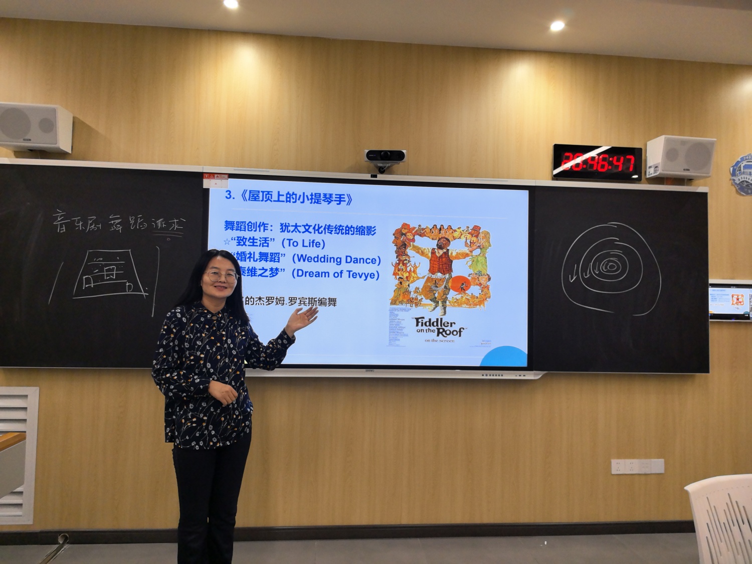 正值五四青年节,杨老师以青年为题,讲到经典音乐剧《西区故事》和《屋顶上的小提琴手》中舞蹈的诉求和内涵,深入剖析音乐剧的艺术表达与思政价值,引导青年学子在艺术审美中感悟文化自信与成长担当。杨老师以杰罗姆·罗宾斯的编舞艺术为切入点,解析两部作品的舞蹈设计如何承载戏剧内核。在《西区故事》中,街头帮派的“群殴舞”以爵士乐节奏和爆发性动作展现种族冲突的张力。而《屋顶上的提琴手》则通过犹太民间舞与踢踏舞的融合、包括婚礼的“顶瓶舞”,生动刻画东欧移民对传统的坚守与革新。杨老师通过欣赏和同学们的互动,让同学们感知音乐剧对青年的关注、对文化传承的关注,激励大家领悟音乐剧给予我们的启迪。