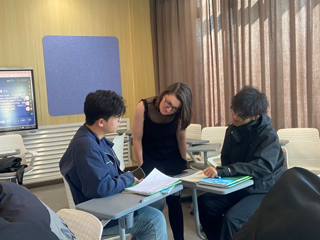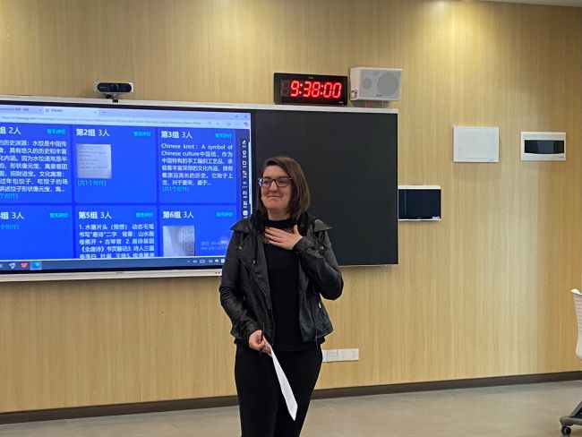 在评价环节,郝崇伶老师肯定了同学们在整个项目进行中的创新性和不懈努力,希望通过这次活动不断提升学生4C能力,包括Communication(沟通)、Critical Thinking(批判思维)、Collaboration(协作)、Creativity(创新)。外教Lauryn从语言表达的规范性和跨文化视角进行评价,希望同学们在专业术语的英译时更贴近国际表达习惯,同时她肯定了这次活动的意义,称“这次活动她深入了解了中国文化,这是非常珍贵的跨文化对话。”
