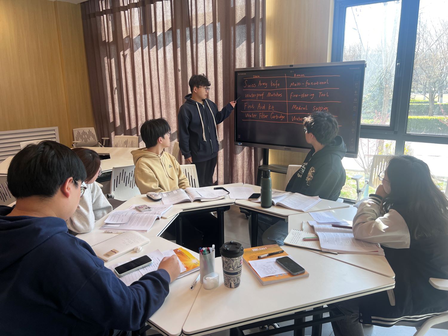 本次教学活动通过模拟全球通用的生存决策场景,将英语思维训练与跨文化认知有机结合,既发挥了学院小班教学的互动优势——每组5-6人的围坐布局便于深度对话,又体现了教育的定制化特色——从工具选择到需求层次分析,每个环节都精准对应语言应用与思维发展的双重目标。这种创新实践表明,当语言学习融入真实问题解决的情境时,教育便能实现知识传递与能力培养的有机统一。
