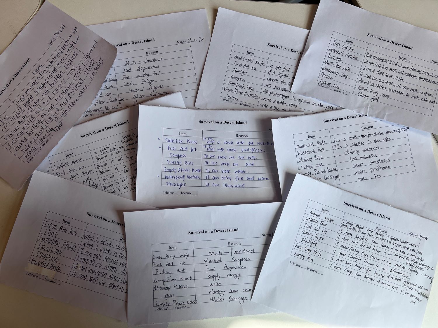 活动设计遵循"个体思考-群体协作-集体升华"的三重逻辑,形成立体化学习体验。在独立思考环节,学生从30种生存工具中精选5项并绘制关联思维导图,老师即时标注的优秀表达如"portable water filter ensures safe drinking",直观反映学生的语言产出质量。进入小组博弈阶段,学生需用英语记录淘汰辩论过程,针对"选择渔网还是炊具"的争议,各组结合优先级量表进行深入论证,展现出较为清晰的逻辑框架。这种基于真实语境的语言实践,提升了学生的学术辩论能力。