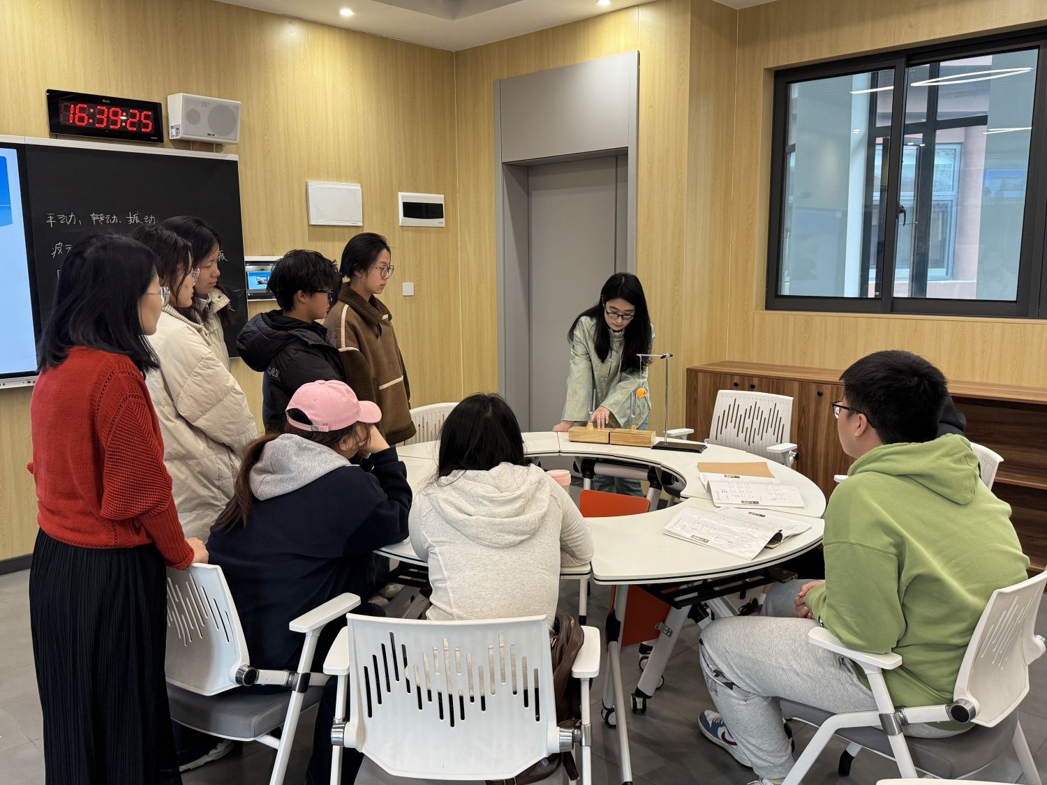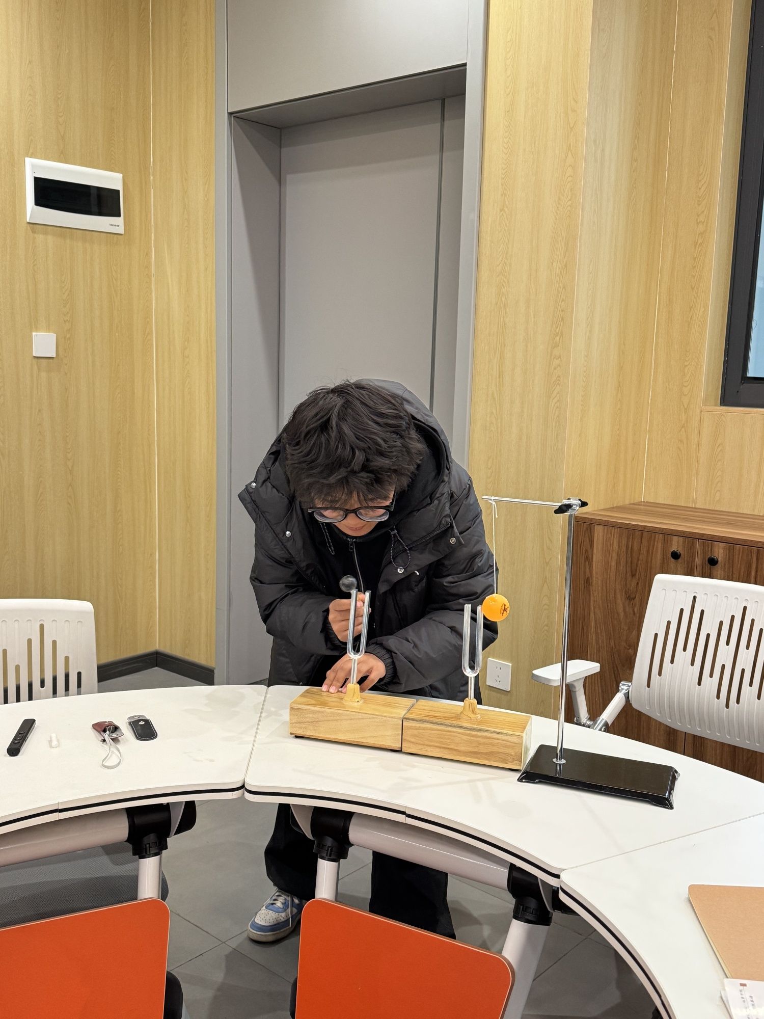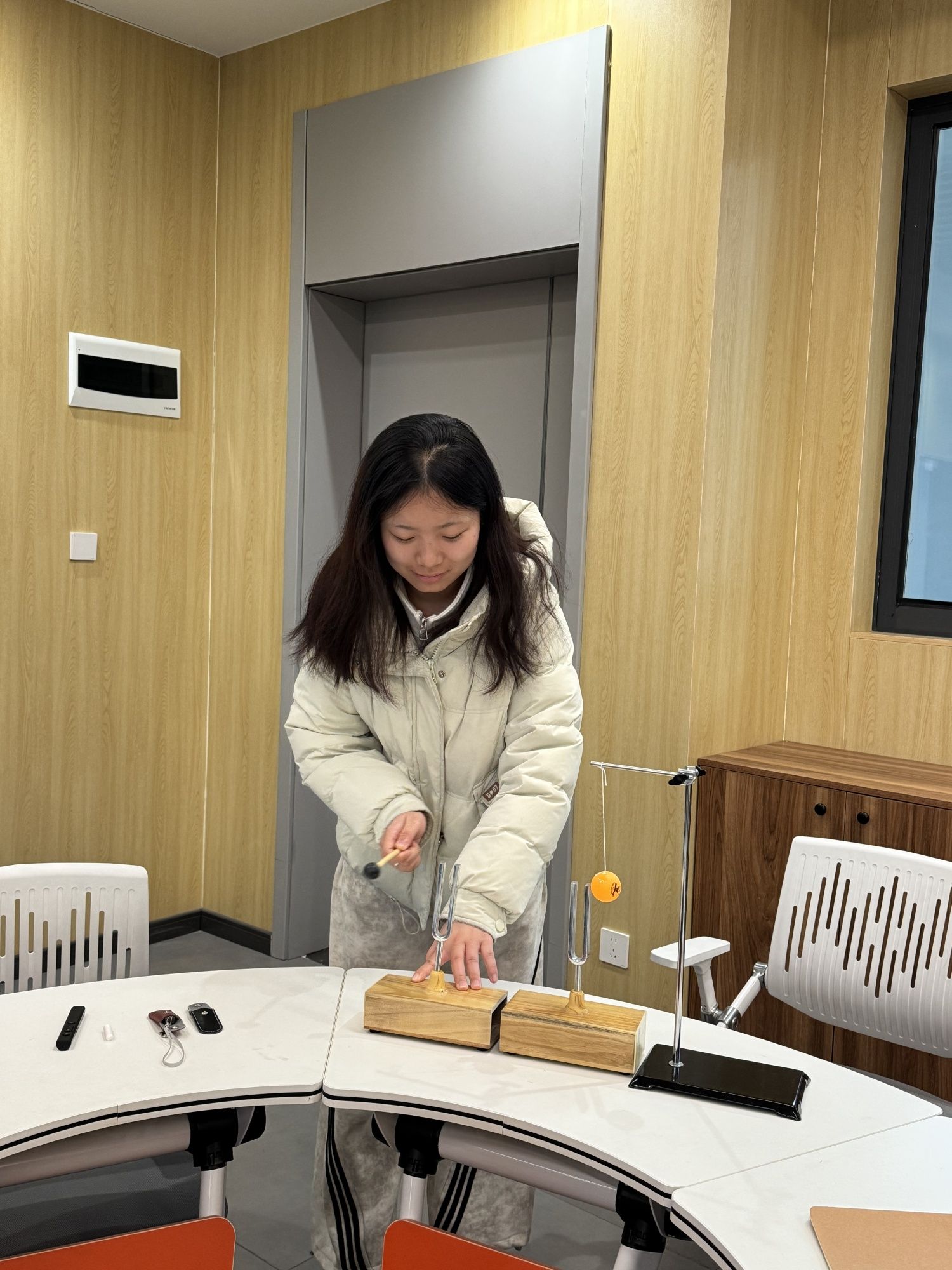 许老师讲到《论衡》中对声音的阐释“生人所以言语吁呼者,气括口喉之中,动摇其舌,张合其口,故能成言”,并通过生活中的机械振动现象(心脏、钟摆)讲到振动的原理,放之古琴,古琴的十三个徽位就是天然的频率刻度尺。许老师通过横波和纵波的动态图解,以及水滴落水的扩散涟漪形成的波,讲到古琴的声音传播。许老师还为同学欣赏到,电视节目当中的人声与杯子的共振,让同学们感受声音传播的力量。许老师还讲到孟姜女哭长城、过桥步伐是否要一致等经典的生活中的共振现象案例。最后,让同学体验共振音叉的实验,感受共振的原理和应用。当许老师敲击音叉时,会引起另外一个音叉旁边的乒乓球的晃动,说明相同的频率声波的传递引发的振动现象,同学们也纷纷进行了敲打,观察乒乓球的动态,进而感受共振的原理。