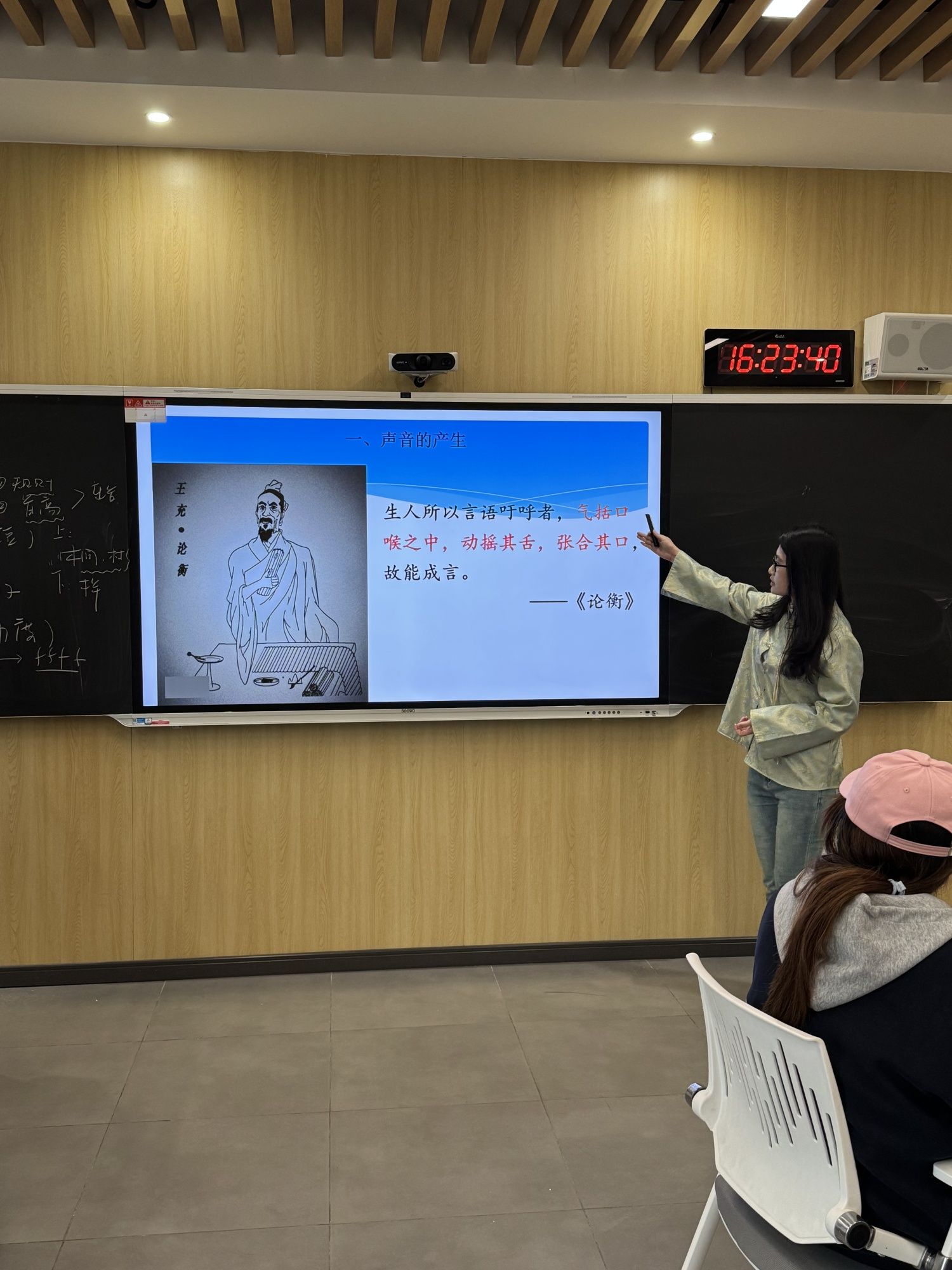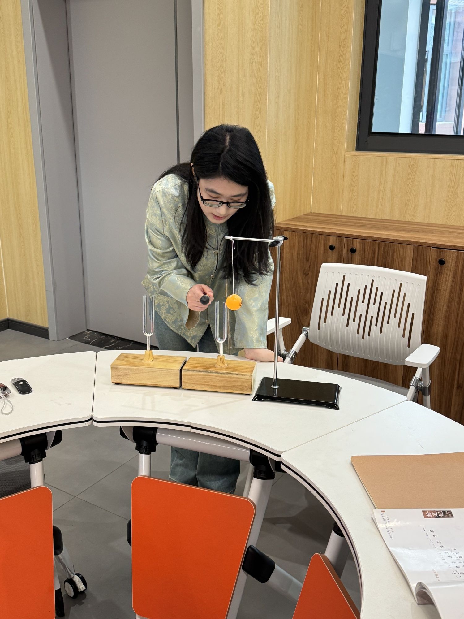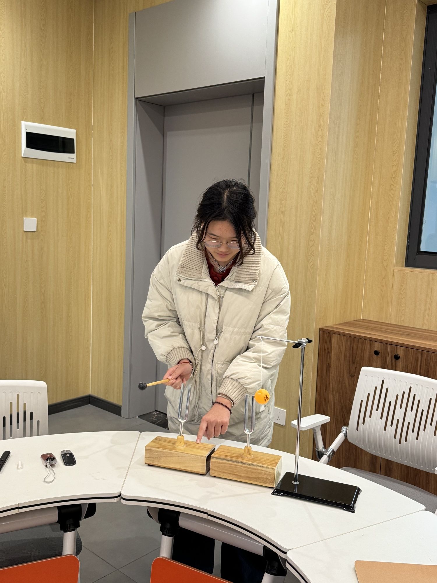 许老师讲到《论衡》中对声音的阐释“生人所以言语吁呼者,气括口喉之中,动摇其舌,张合其口,故能成言”,并通过生活中的机械振动现象(心脏、钟摆)讲到振动的原理,放之古琴,古琴的十三个徽位就是天然的频率刻度尺。许老师通过横波和纵波的动态图解,以及水滴落水的扩散涟漪形成的波,讲到古琴的声音传播。许老师还为同学欣赏到,电视节目当中的人声与杯子的共振,让同学们感受声音传播的力量。许老师还讲到孟姜女哭长城、过桥步伐是否要一致等经典的生活中的共振现象案例。最后,让同学体验共振音叉的实验,感受共振的原理和应用。当许老师敲击音叉时,会引起另外一个音叉旁边的乒乓球的晃动,说明相同的频率声波的传递引发的振动现象,同学们也纷纷进行了敲打,观察乒乓球的动态,进而感受共振的原理。
