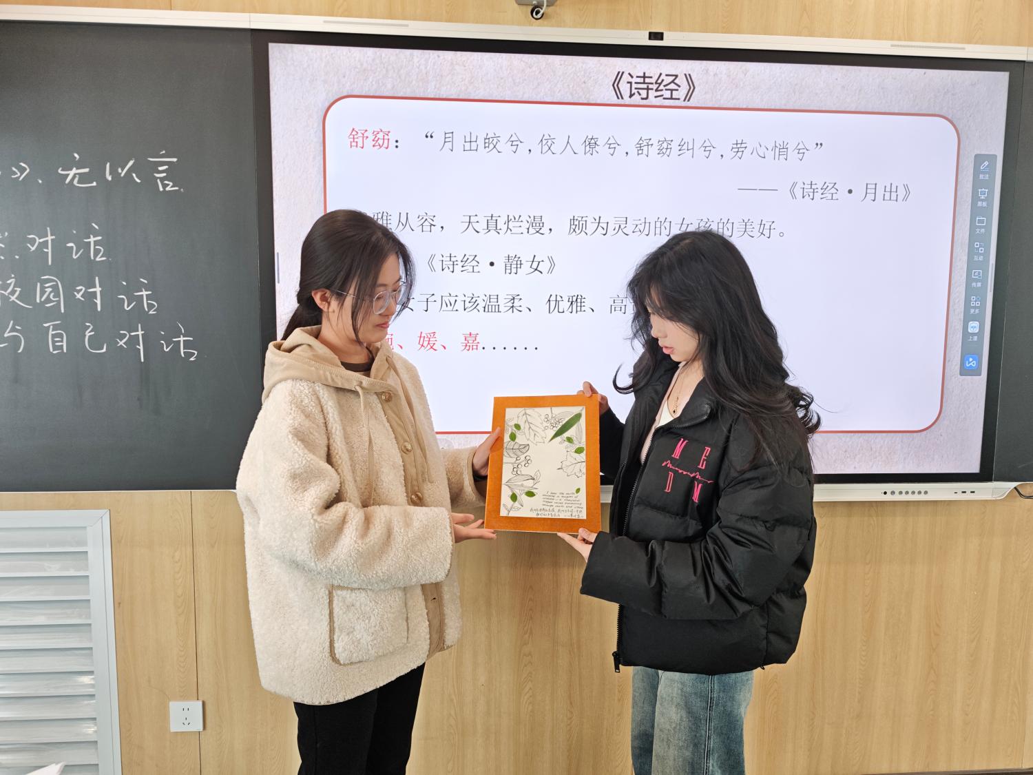 在理论学习环节,赵若男老师通过生动的讲解和丰富的案例,引导学生们深入理解了春秋时期诗教观的核心思想及其在外交场合的应用。她强调了“不学诗,无以言”的重要性,并解释了“兴观群怨说”的深刻内涵,为学生们的创作实践打下了坚实的理论基础。