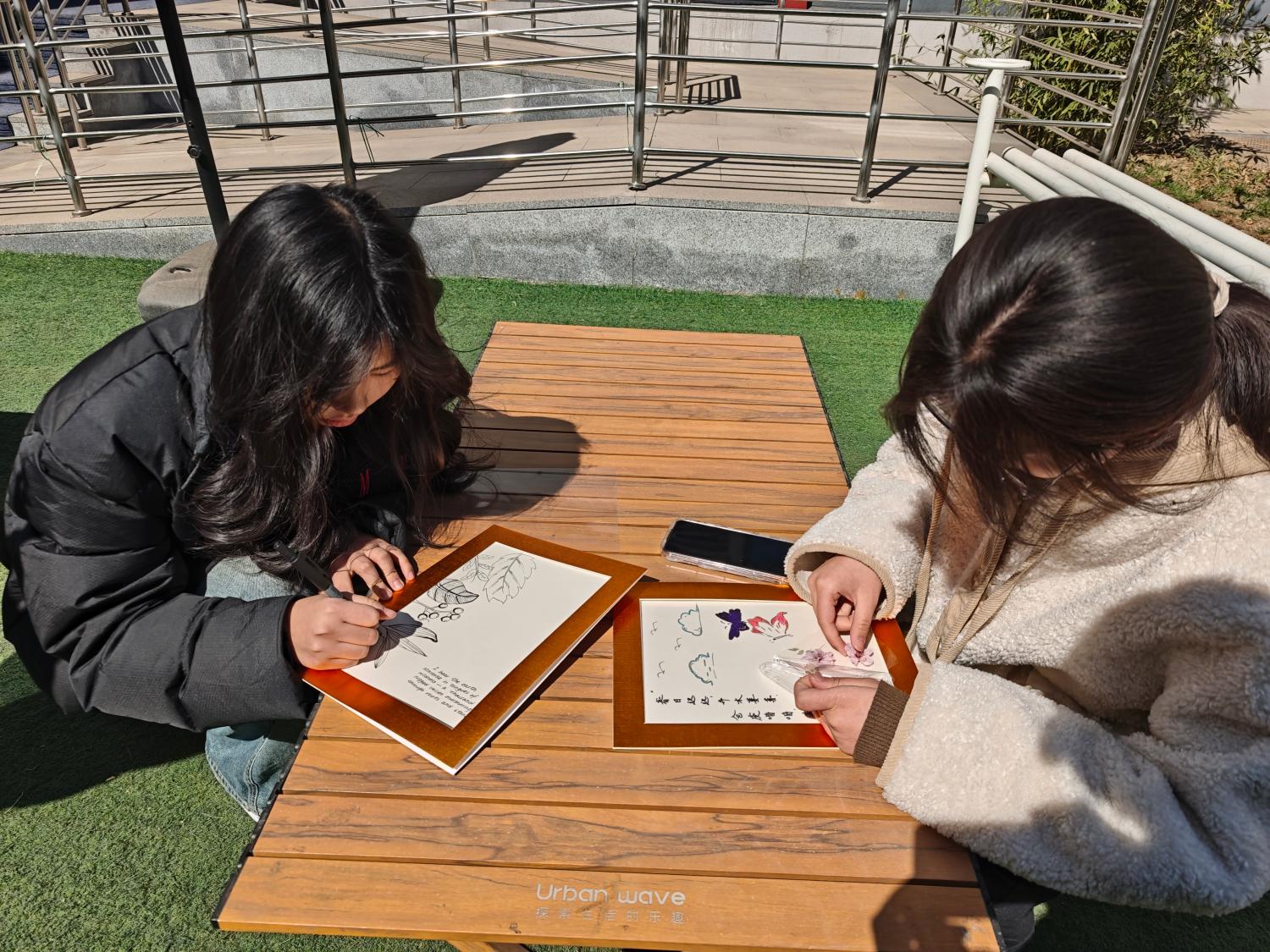 进入实践创作环节,学生们分组在校园内进行诗歌创作。赵老师鼓励他们结合个人兴趣和校园生活,将孔子诗教观融入作品之中。她指导学生们如何寻找灵感、构思诗歌,并引导他们运用不同的诗歌形式来表达自己的思想和情感。