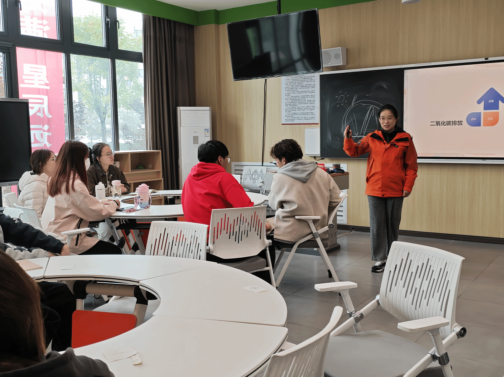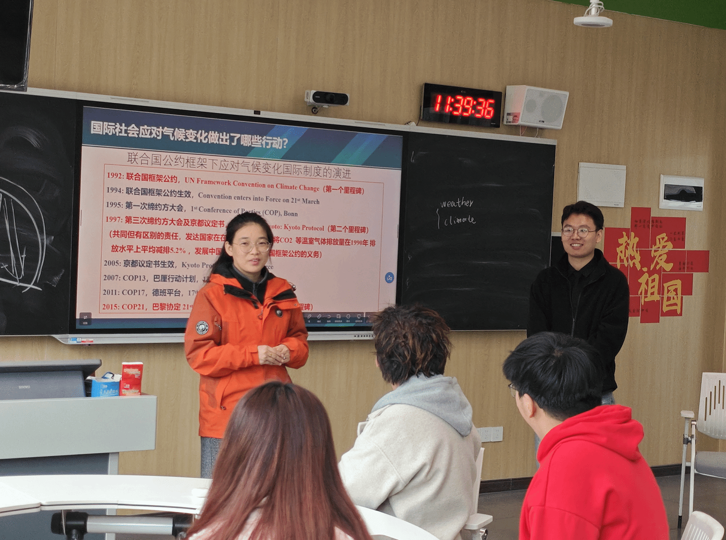 李炜莉老师开始授课,全球变暖已成为公认的共识,各国该如何应对呢?紧接着李老师为学生们带来了应对气候变化的解决措施。她介绍了全球合作的重要性,强调了共同但有区别的责任原则,并详细解释了碳达峰和碳中和的概念。同时,她还展示了我国在应对气候变化方面的负责任表现,让学生们了解到我国在全球气候治理中的积极贡献。